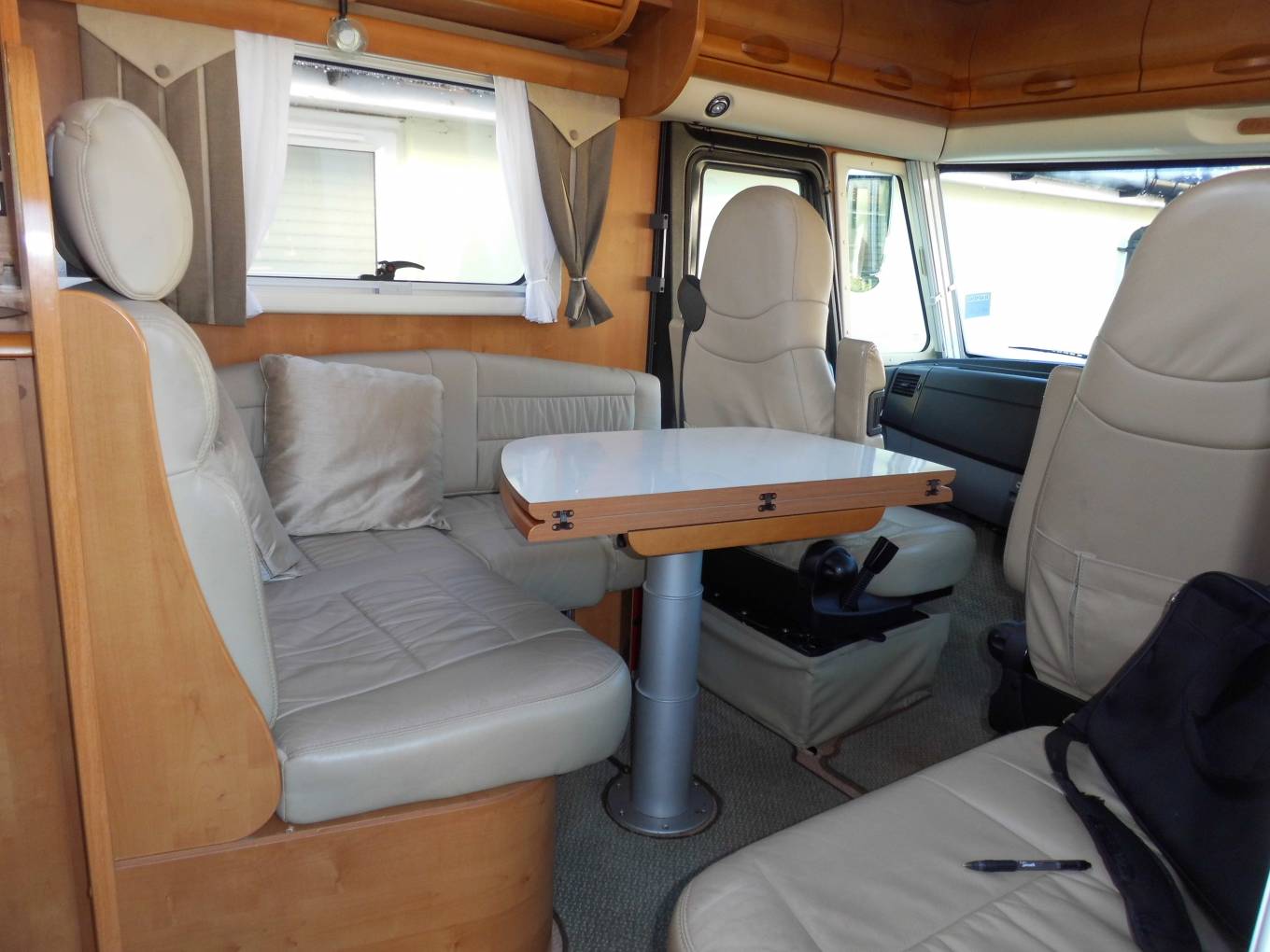 Moving further towards the cab there is a lounge/dining area with two forward facing seats with 2 x 3 point seat belts and side bench. The cab seats swivel to provide a dining area with comfortable space for 5-6 people. The cab area has “Grand Comfort” seats, dashboard with walnut burr effect, electric defrosting side mirrors, driver’s air bag, ABS-ASR-ESP and cab air conditioning. It has automatic transmission and a reversing camera..