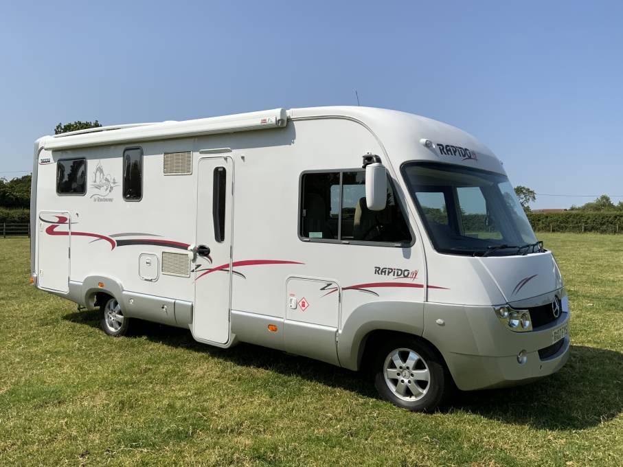 here we have a Rapido 966m automatic Mercedes based a class motorhome. Featuring twin rear beds over a large garage, and with a huge drop-down bed over the This motorhome can comfortably sleep and travel four adults.