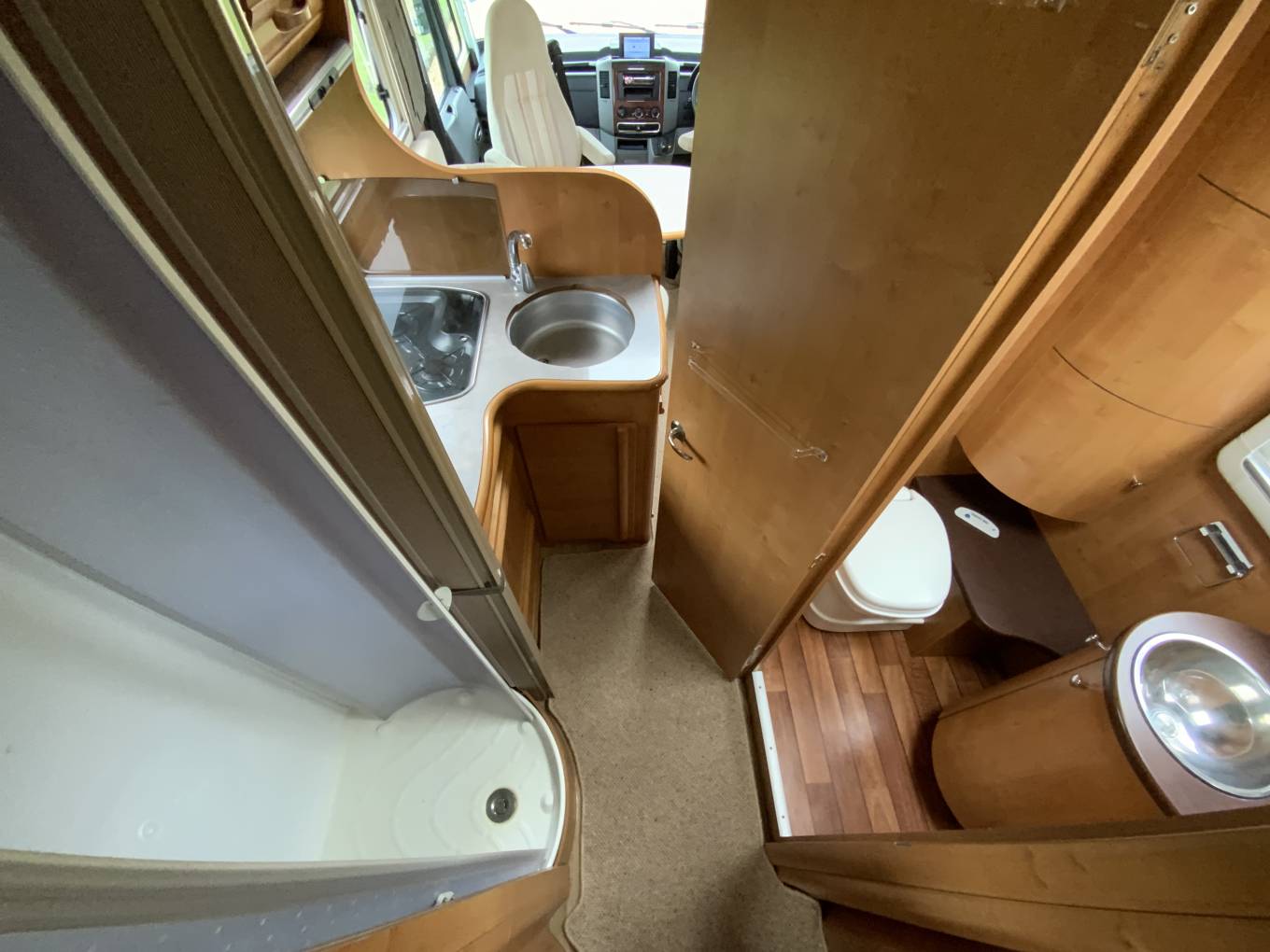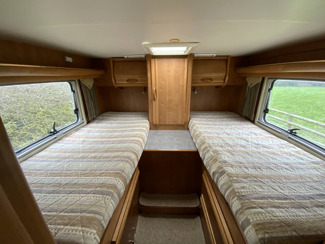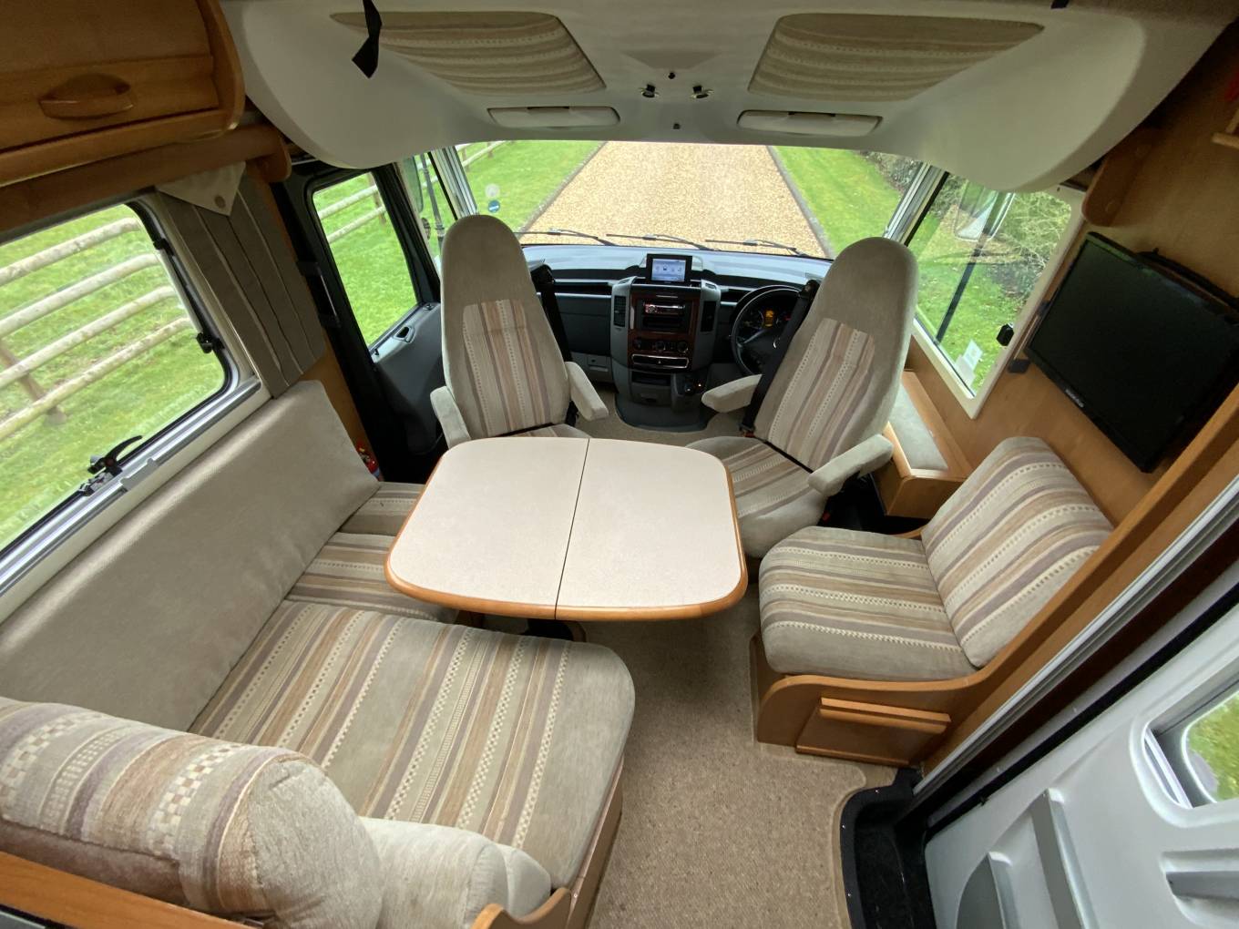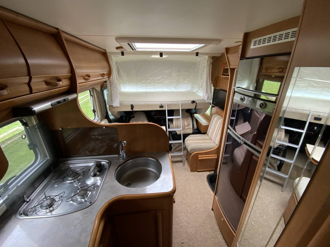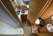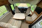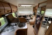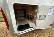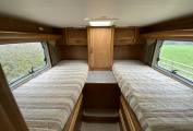 starting at the rear of the vehicle we have 26 beds, both of which have large storage drawers accessed from inside the vehicle and a huge garage with external shower can be accessed from outside. Move into the centre of the vehicle. We have a washroom which features cassette toilet and hand wash basin opposite a separate shower. also in the centre we have a well equipped kitchen with a fridge freezer, small oven combination grill, hob with extractor and sink. At the front of the motorhome we have a large seating area I can comfortably seat six by utilising the two swivel front seats. Over the cab is a huge pull down bed. The cab features, cruise, control, air-conditioning, reversing camera, screen and cab blinds.