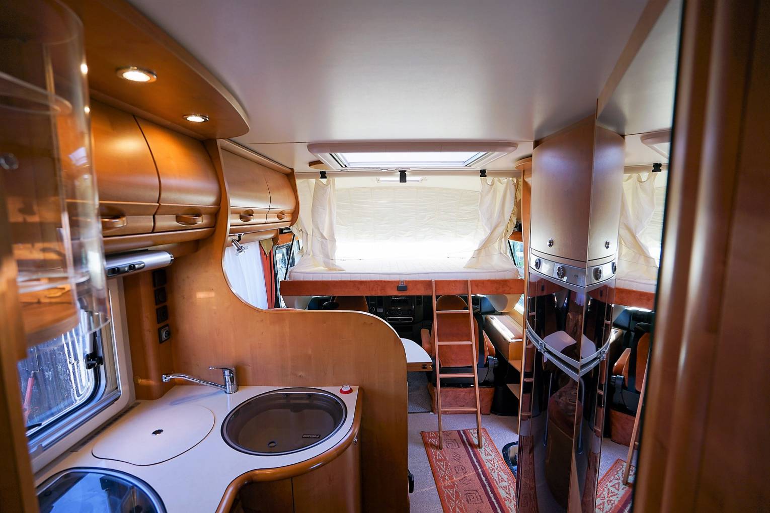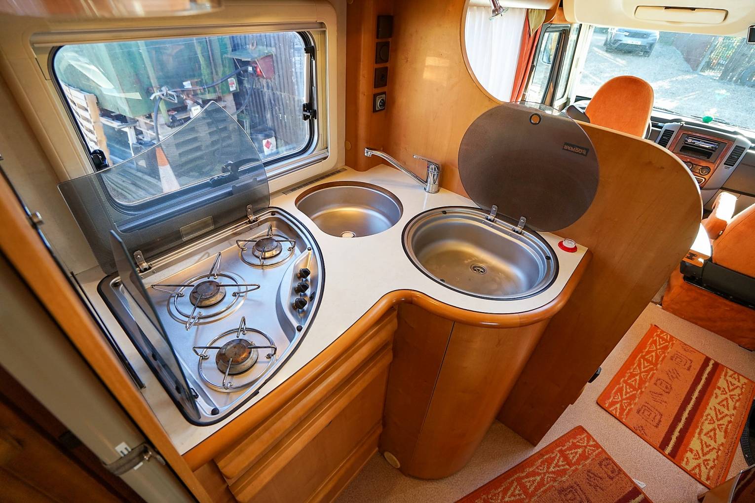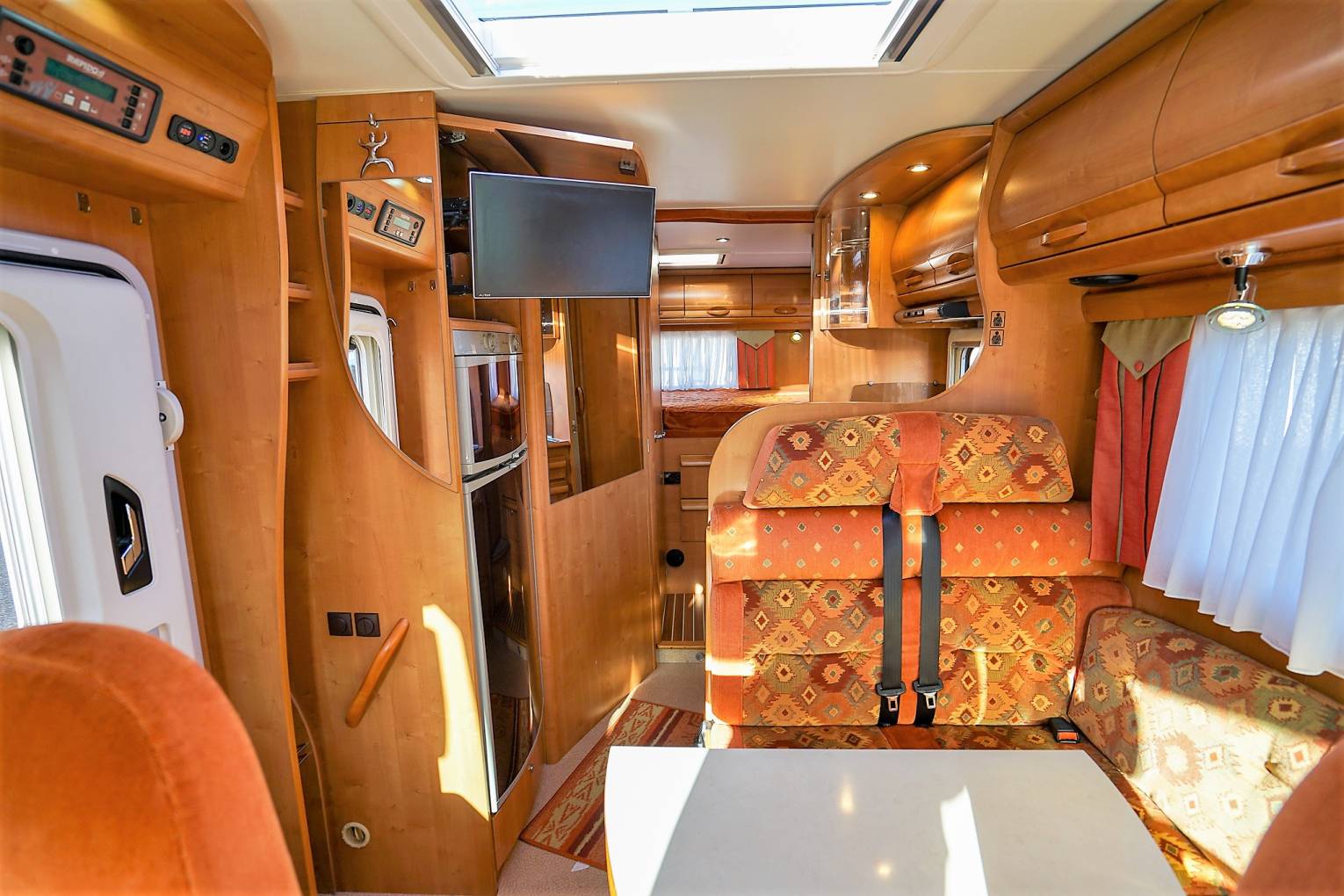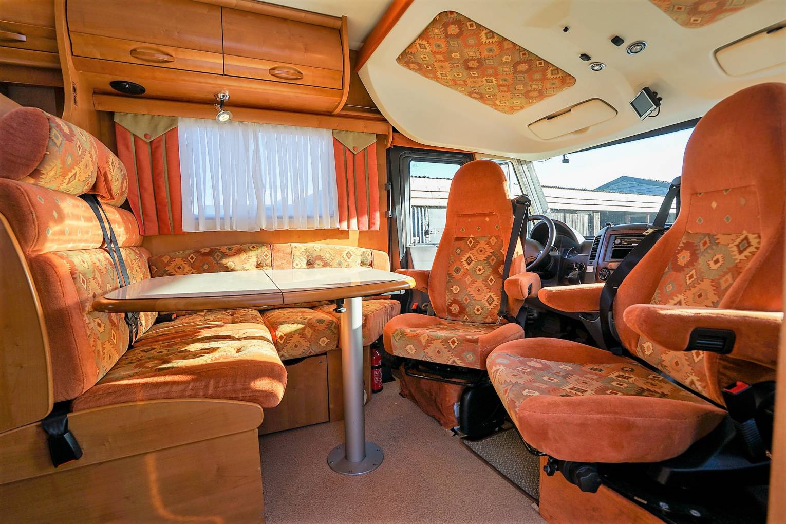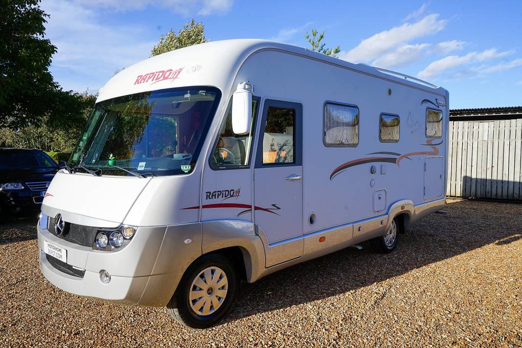 Luxury Rapido 983M Mercedes A class LHD Motorhome 4 Berth with four travelling seats, fixed rear bed, large Motorcycle sized Garage and double drop down bed over the cab. Low Mileage and Just one previous owner. Fitted with Solar Panel, Reversing Camera, Refillable LPG gas bottles, Maxview Satellite system, Spare Wheel, Shower Point, Avtex TV/DVD Secondary Diesel heating fitted in addition to the standard Truma gas powered heating fitted as standard.