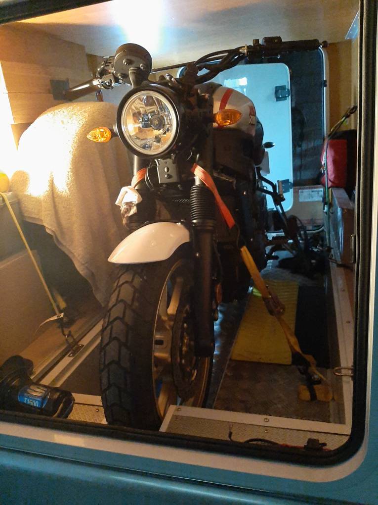 Current owner has toured Europe with a full sized XSR 700cc Yamaha Motorcycle (not included) stored in the Garage which has been modified to provide support for the front wheel and a strengthened Floor & anchor points.