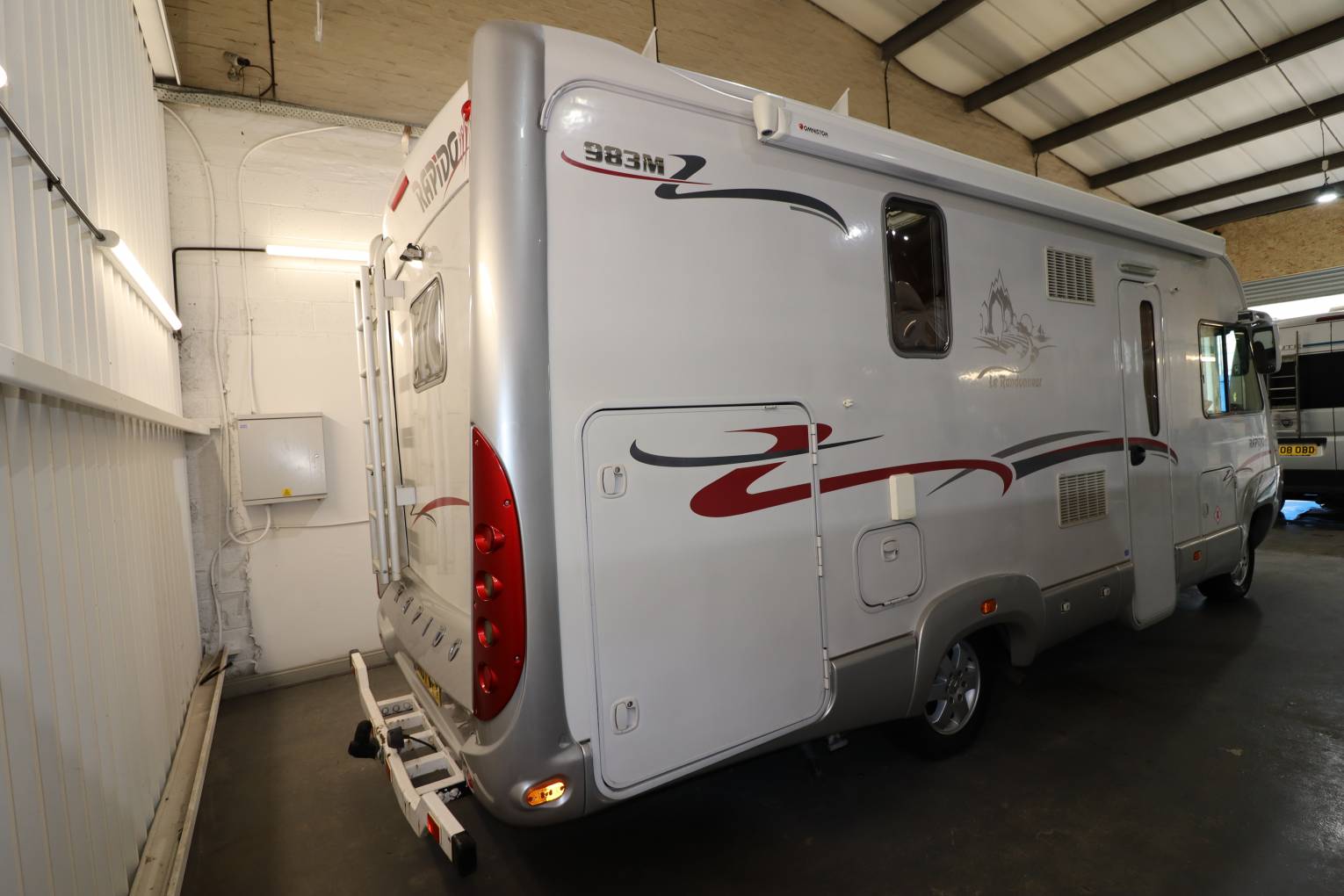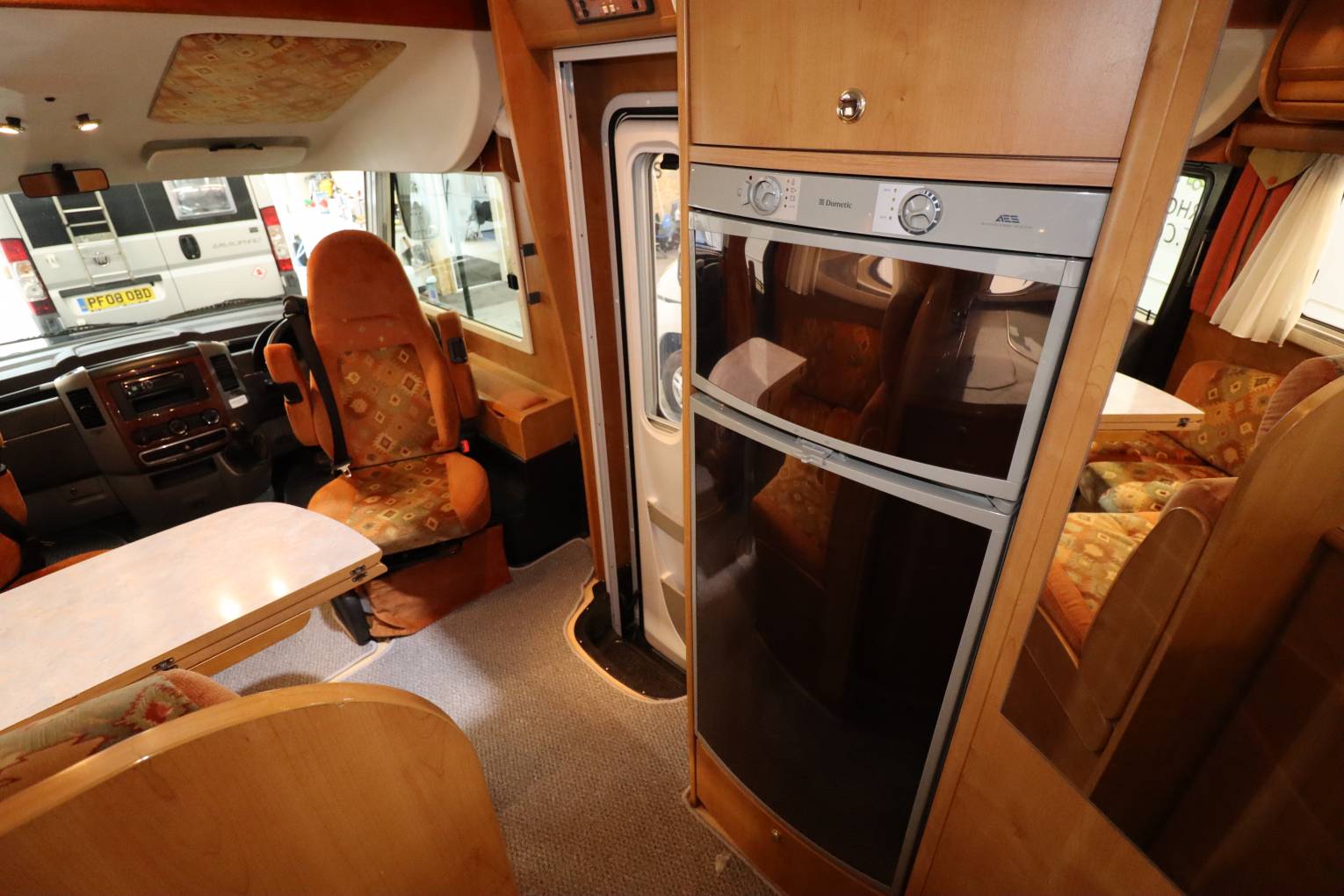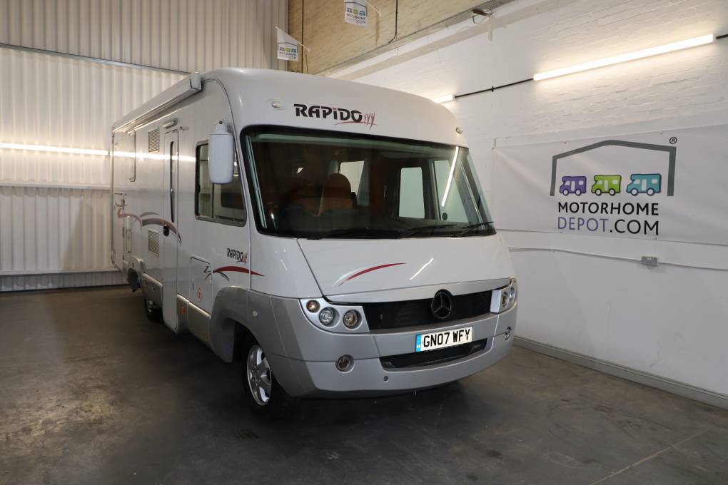 A Luxury Right Hand Drive Rapido Mercedes with four travelling seats, fixed bed and Garage. A Large drop down bed is at the front, central lounge area with 2 extra seat belts. The kitchen is central with large fridge/freezer, oven, grill, hob and sink. The washroom is central with a separate shower. A large fixed rear bed is above the garage.