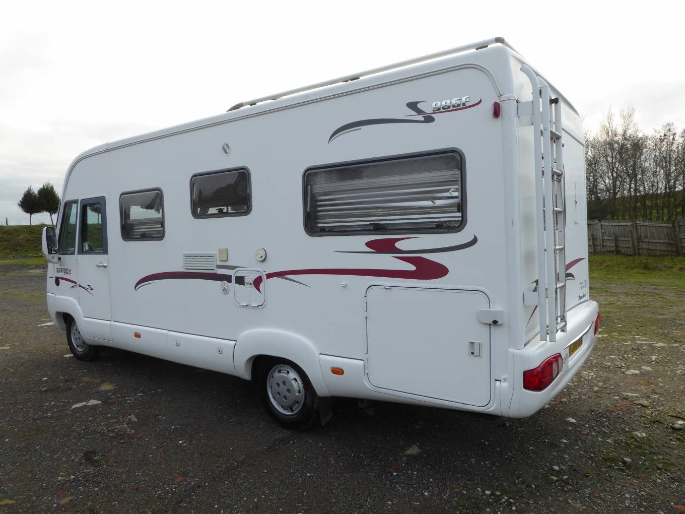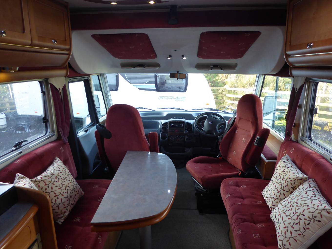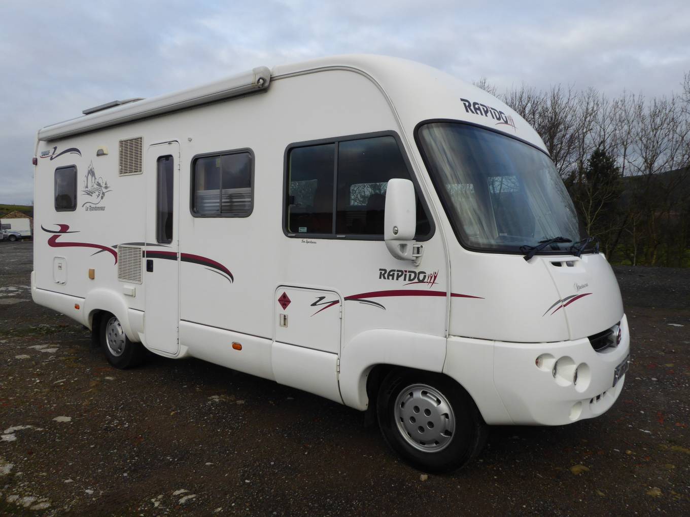 This is a Rapido Le Randonneur 986F first registered in May 2006 with approximately 65,000 miles on the clock. It weighs 3850kgs, is 6.8m in length and this A-Class motorhome is built on a Fiat Ducato chassis and had timing belt changes in 2012 and then 2017 at 57099 miles. It comes with an MOT lasting until January 2020. It’s really well presented both inside and out at the rear there is large rear bed with plenty of storage space underneath. The washroom has a toilet, sink and a fully enclosed shower. There is a tall wardrobe with plenty of hanging space. In the kitchen area there is a SMEV oven and grill, 3 gas burners, sink and opposite a tall Dometic fridge freezer. In the front lounge there are two sofas facing each other and the table that’s fitted can be neatly stowed away whilst travelling and can be made double the size when entertaining and this creates a convivial environment especially when both the front seats swivel. The over cab bed comes down very easily and creates a large double bed and of course the key thing with A class is the view and it doesn’t disappointment. There is a radio/CD player, cab air conditioning, 5 speed gearbox and diesel heating as well as the Truma heating for water and habitation. It also benefits from screens in the cab area, tracker device for which subscription will be required. All in all a nicely presented example of a Rapido 986F. This motorhome should be seen at the earliest opportunity in Skipton, North Yorkshire. Please note this vehicle is owned by a dealer, as a potential buyer, should you purchase this vehicle, if the vehicle is not as described, of satisfactory quality or fit for purpose you may have a claim under the Consumer Rights Act 2015. Part Exchanges welcomed on this vehicle, for further information and photos please call us on 01423 609985 quoting Reference 86995