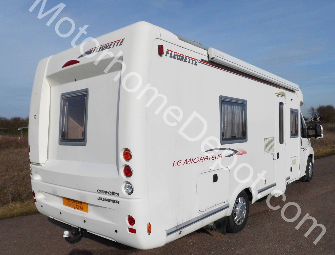 PRICE REDUCED - Here is an opportunity to purchase a Rapido Fleurette Migrateur 73LJ on a 2007 Citroen Jumper chassis with a 2999 cc engine. Manual, diesel, left hand drive. MOT to 25.07.2020 but will have a new MOT at point of sale, and 55,939 miles. From the rear there is an enclosed ladder for access to the roof, a tow bar hitch and reversing sensors. Moving to the offside there is an Omni-V10 wind-out canopy over the habitation door. Entering this door via the low level step and turning left is the large fridge freezer, further on are 2 fixed single beds with storage under and access from inside and out. At the rear is the washroom with separate shower, hand basin and toilet. The bedroom area has a folding door for privacy. Turning around and on the left is the kitchen with sink and drainer, both of which have glass hinged covers, 3 gas ring hob with glass hinged cover with a Dometic extractor above and cupboard space under. Proceeding to the lounge dining room there are 2 lounge seats, one with two 3 point seat belts, the table lowers to a level for this area to be converted to a double bed. A large rooflight floods the area with light. There is a TV in the cupboard above on a swivel base for viewing from the lounge and bedroom. Entering the cab area, the driver and passenger seats are Captain swivel seats and both have 3 point seat belts. there is a radio-CD, cab air con, reversing sensor screen, a rear view screen and a Aguri seven inch touch screen sat-nav. Mounted on the dashboard there is a socket for 12v and USB. Features of the vehicle are: Warm air heating, satellite TV aerial, four travelling seat belts, division for privacy in bedroom, fly and blackout screens in the habitation area, fold-away TV, large fridge freezer, rear camera, sat-nav and reversing sensors