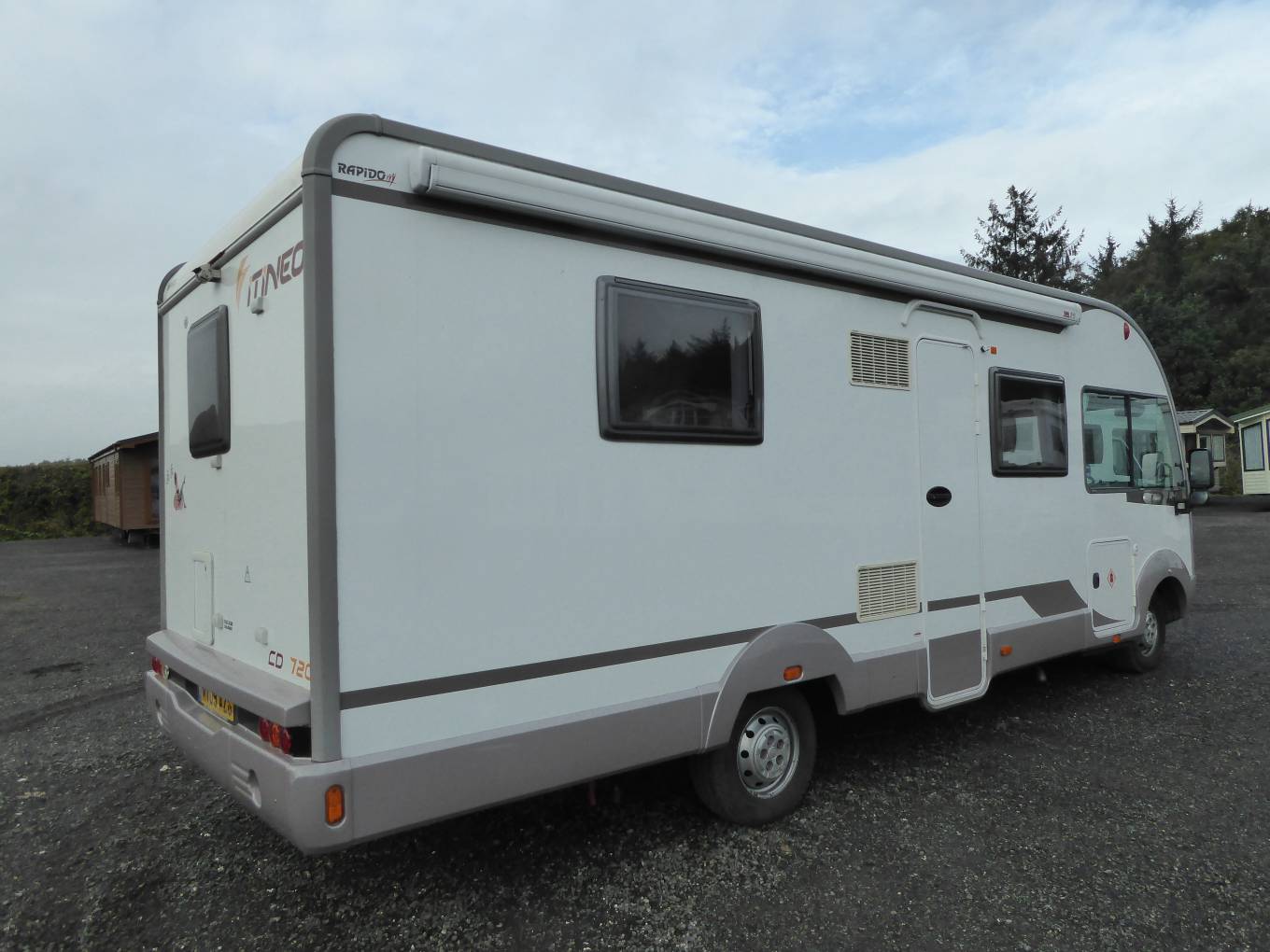 Call with any questions on 01423 609985. This is an A Class Rapido Itineo CD720 first registered in May 2009 it has travelled just under 30000 miles and comes with a long MOT lasting until June 2019. It sits on a Fiat Ducato chassis, measures approximately 7.2m in length and weighs 3500kg. The timing belt was changed at 21678 miles in 2017 and it is in good condition throughout. Internally at the rear is the washroom that covers the full width of the motorhome and this includes a toilet, sink and shower with cubicle. Off to one side is a wardrobe for clothing and in front of this you will find the transverse double bed measuring approximately 5ft 10inches x 4ft 4inches with lots of storage space underneath and a privacy screen which separates this area from the rest of the motorhome. On one side of the kitchen area there is a stove with 3 gas burners, sink and additional worktop space created by the pop-up worktop. Opposite is the large separate fridge and freezer, this makes it an ideal touring vehicle as there is also a solar panel on top. As you move forward there are 2 forward facing seats in the dinette both with full seatbelts and a table. There is an additional sofa for seating off to one side. Upfront you get the unmissable view which only comes with an A class motorhome, both seats swivel, there is a reversing camera, 6-speed manual gearbox, radio/CD player and the bed is lowered easily, you don’t need to adjust the seats you just push them right the way back and pull the bed down. It is at an easy height to get in and out of without the need for a ladder.. Other benefits to this motorhome include the 2 cylinders for the Gaslow system which is worth around £1,000, and it has a Growler immobiliser. The condition is great overall and well worth a viewing near Easingwold, North Yorkshire. Please note this vehicle is owned by a dealer, as a potential buyer, should you purchase this vehicle, if the vehicle is not as described, of satisfactory quality or fit for purpose you may have a claim under the Consumer Rights Act 2015. Part Exchanges welcomed on this vehicle, for further information and photos please call us on 01423 609985 quoting Reference 83645.