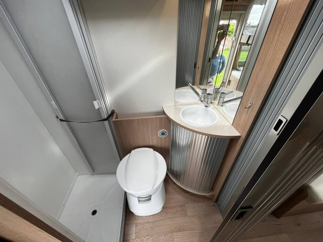 with a tambour-doored area on the offside housing the toilet and handbasin, and