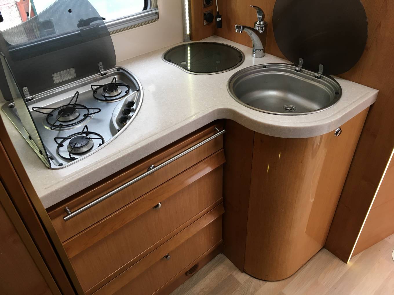 mixer tap, a three gas burner hob, adjacent there is a large Dometic fridge