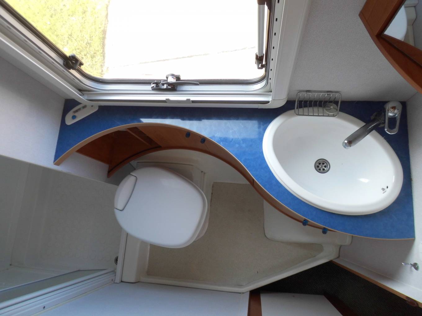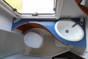 At the rear is a fixed bed with plenty of overhead locker space as well as storage underneath. Across from the bedroom is the stylish washroom which has a toilet, basin, a fully enclosed shower cubicle and loads of storage space in the bathroom cabinet.
