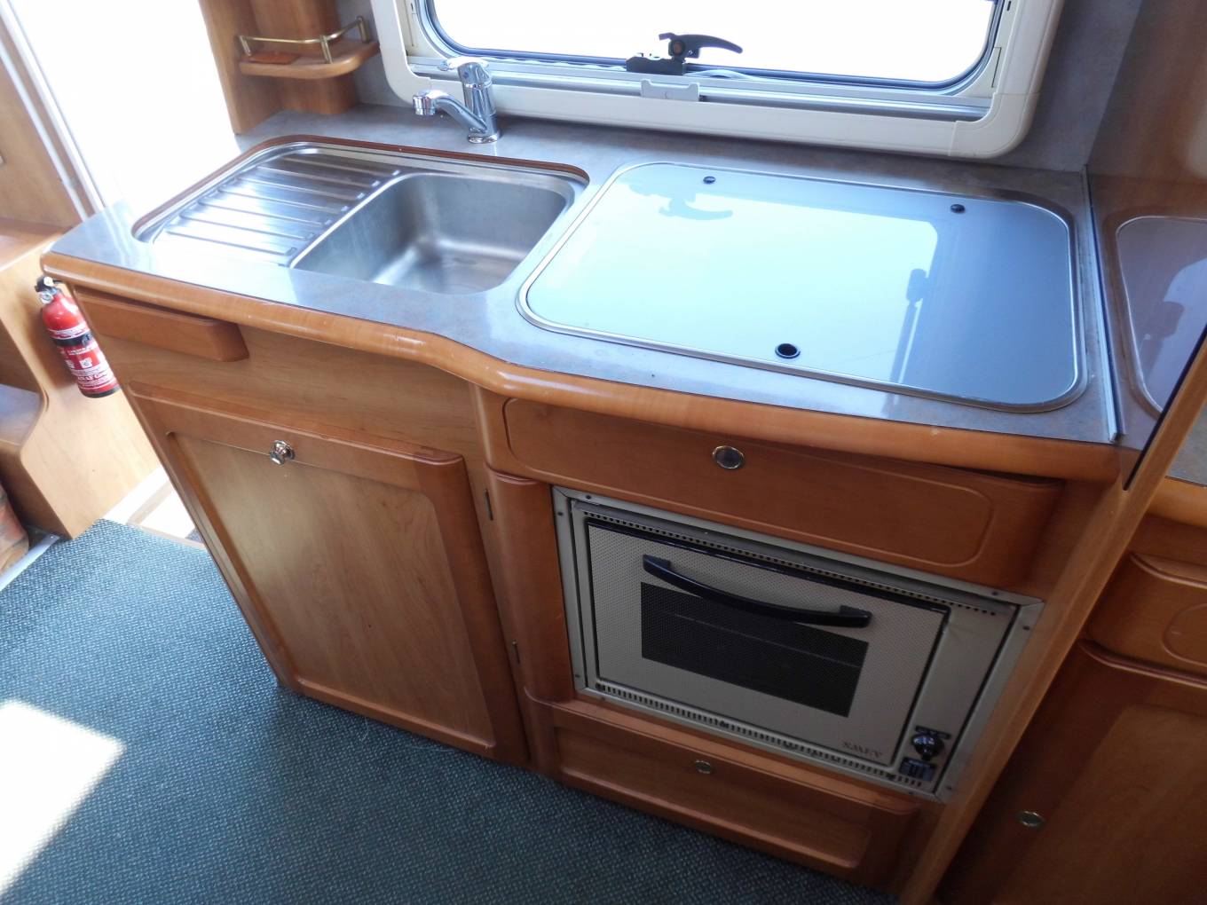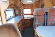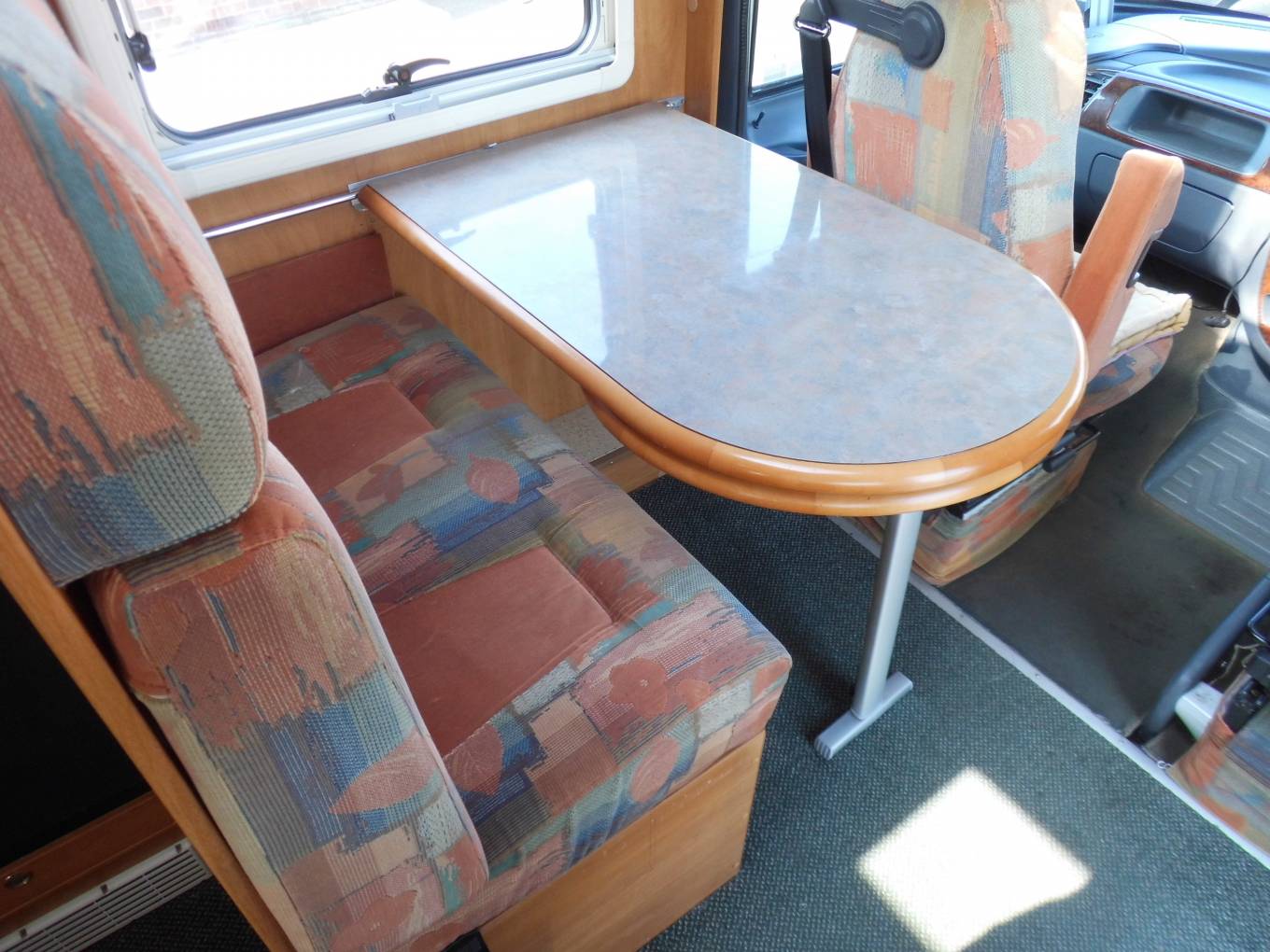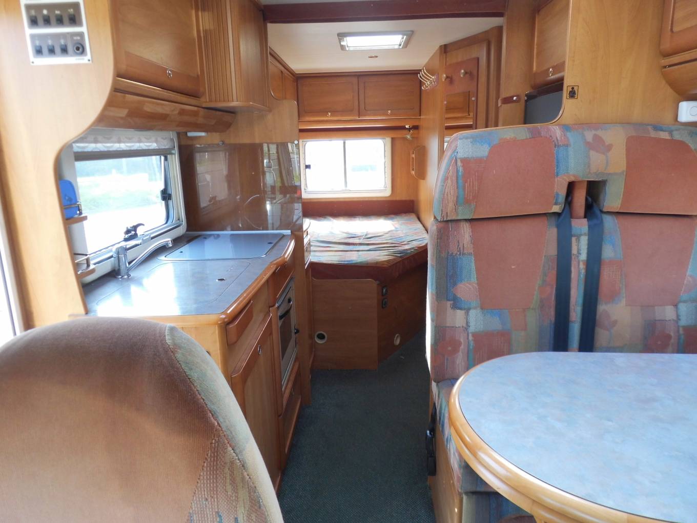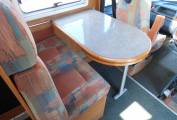 The habitation area consists of a centre dinette with a forward facing 2 seater sofa with 2 seat belts. Both the front seats swivel allowing 4 people to dine in comfort.