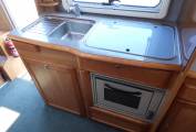 The well appointed kitchen has everything you need to rustle up a gastronomic delight. There is an oven and grill, a microwave, a 3 gas burner hob, a sink with mixer tap and a huge 141 litre Thetford fridge freezer. There is even a TV in the cupboard above the hob.