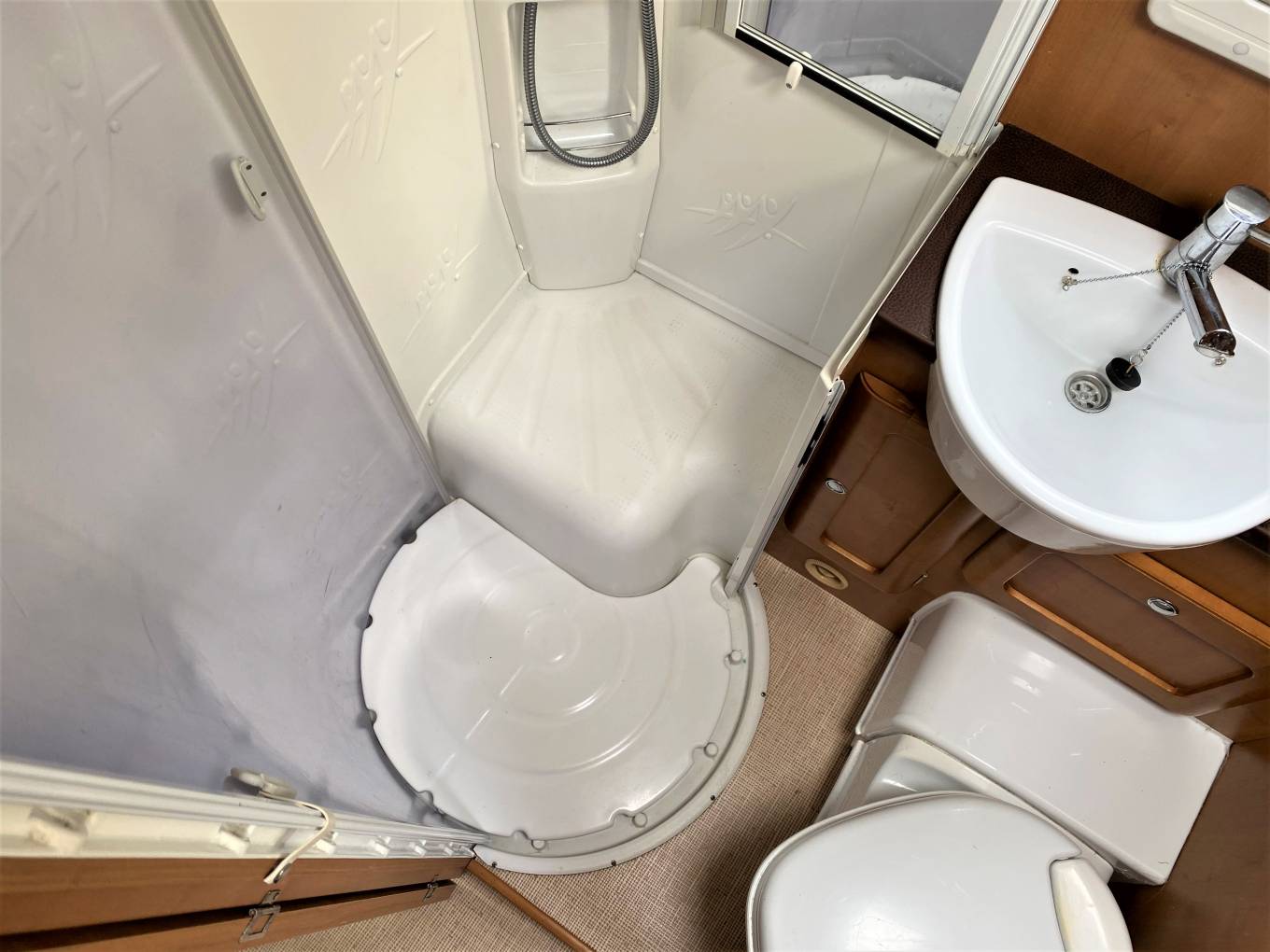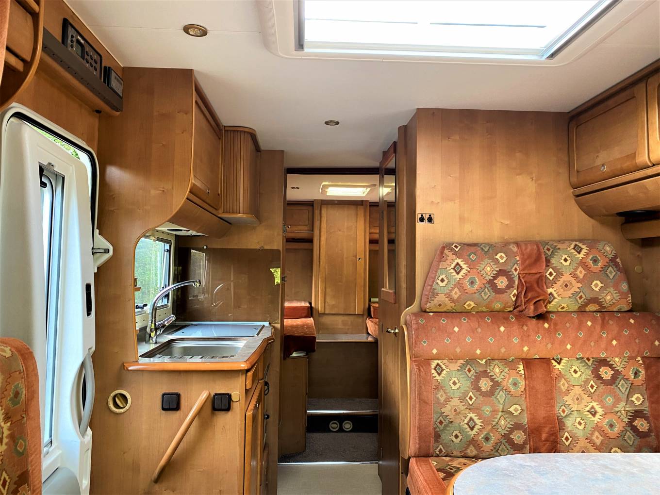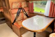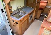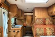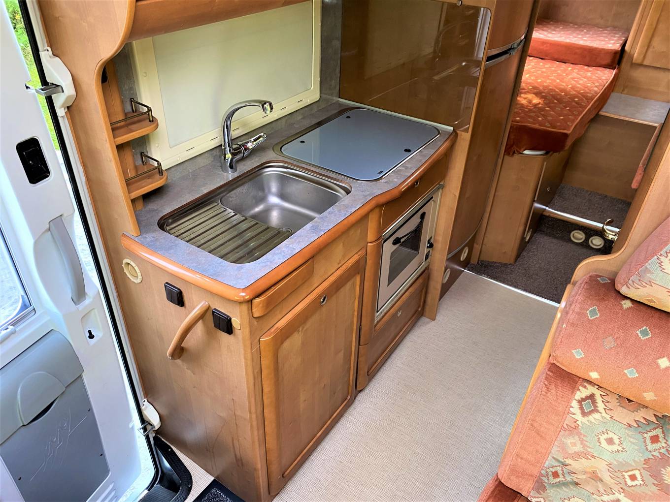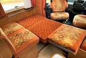 This spacious motorhome features a large dinette to the front with plenty of natural light from two large windows and a sunroof. There is an L shaped sofa, a single seat and two Captain’s seats that swivel to give you seating for 5 - 6 people around a large fully adjustable dining table. This area also easily converts to the additional third bed and can make a small double if required.