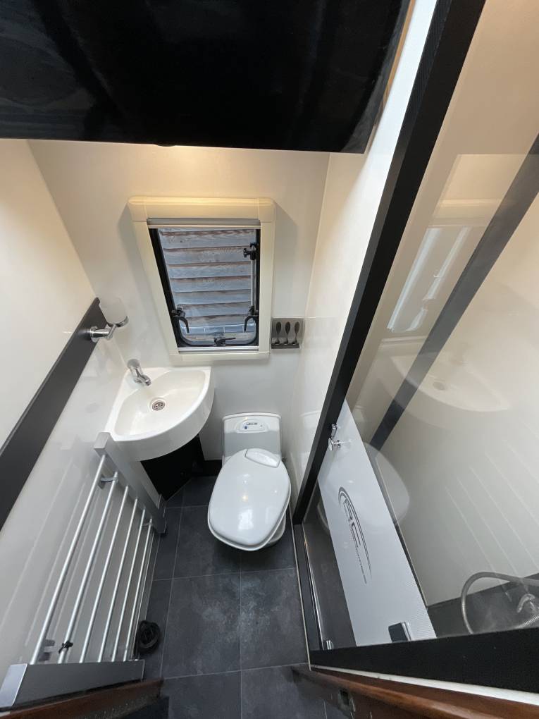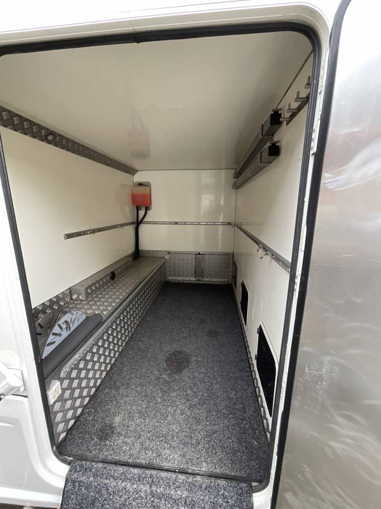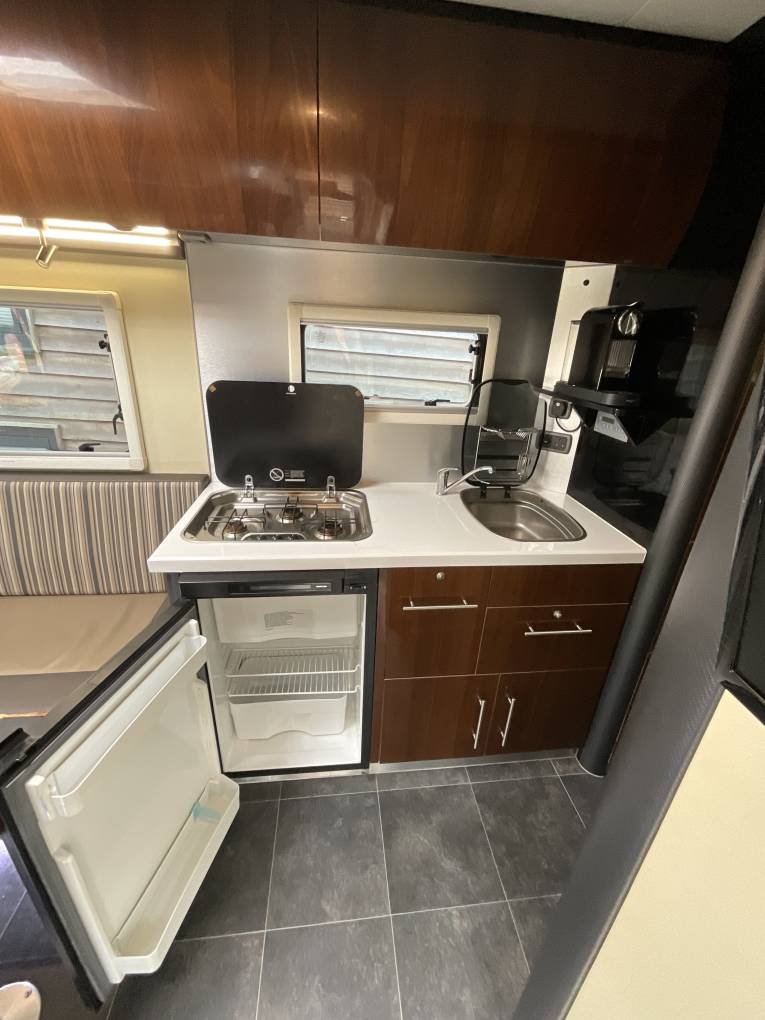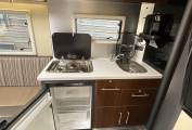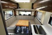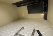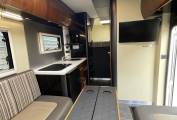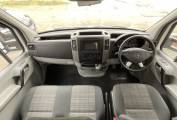 This RC8M is the smallest of the RC fleet, coming in at 8 meters and based on the Mercedes chassis it is plated at 3500kg, so can be driven on a standard licence. The garage has the ability to hold two bikes, with storage cupboards, checkerplate floor and racking for the heavy duty awning legs. Externally the van has a shower point, BBQ point and a 240 power socket. There is an under slung LPG gas tank and a filler point, reversing camera, large under slung water tank and 2 smaller waste water tanks.