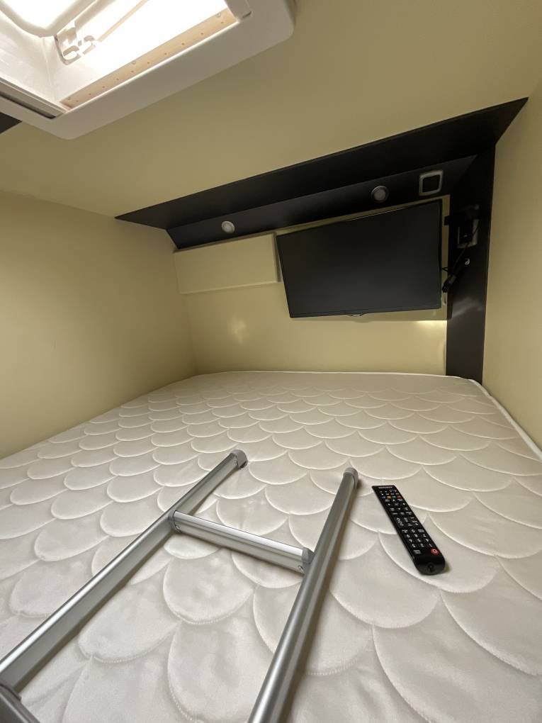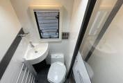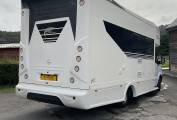 Upon entering the motorhome you are struck with the high quality finish you come to expect from RC Motorhomes, with a high gloss wood finish to the cupboards and leather interior. Opposite the hab door, is the well equipped kitchen with 3 burner gas hob, 3 way Thetford fridge with freezer compartment, sink with chrome mixer tap, coffee machine, microwave and pleanty of storage cupboards. The wash room is spacious with a swivel toilet, corner sink, heated towel rail and a seperate shower enclosure. To the rear is the large double transverse bed, accessed via the ladder, there is a large tv in the corner and lighting to either end. To the front of the vehicle is the U shaped lounge with RC table to the centre, this folds to create 4 drink holders and can be removed. There are large aeroplane over head style lockers to both sides, with ample storage and lighting, a large skylight and side windows allow natural light to flood in. There is a 2nd TV, main control pannel and opperation controls above. From the lounge you access the overcab large double bed, this again has a skylight and the 3rd TV is on the wall.