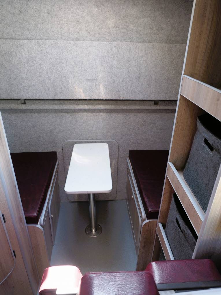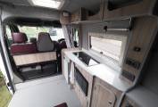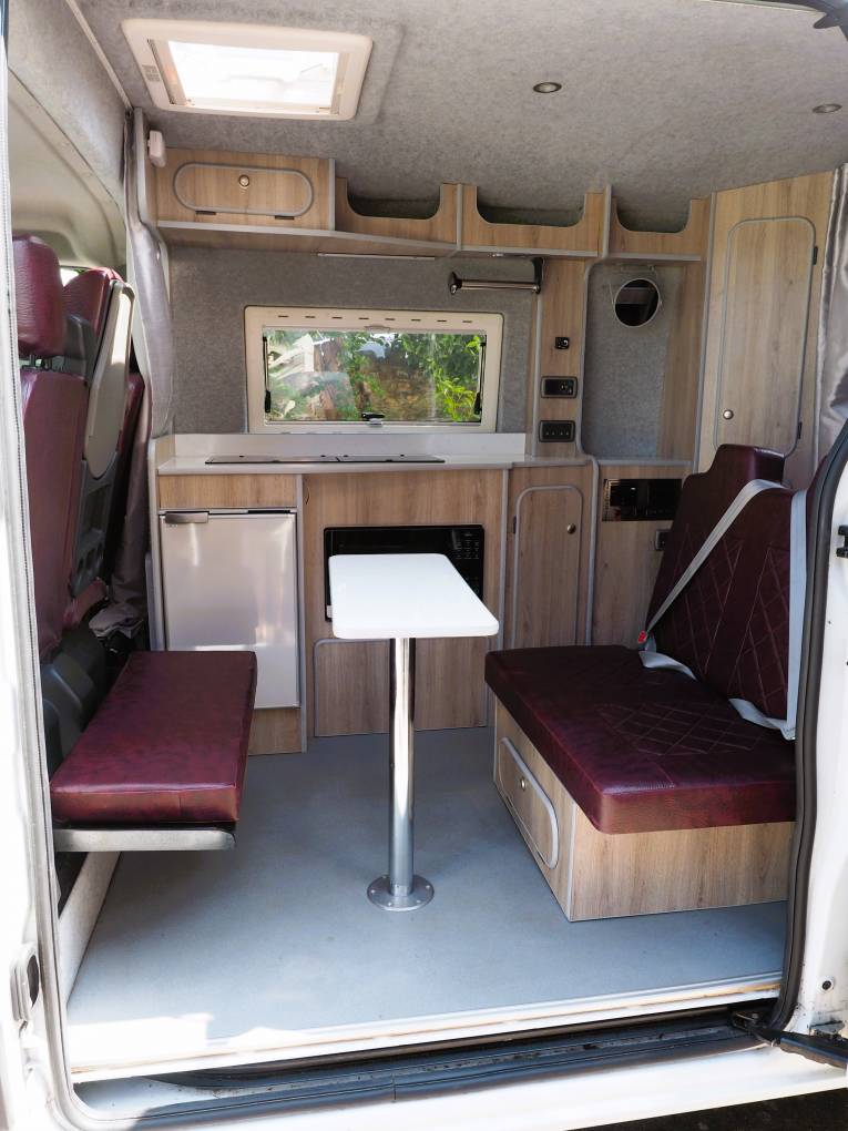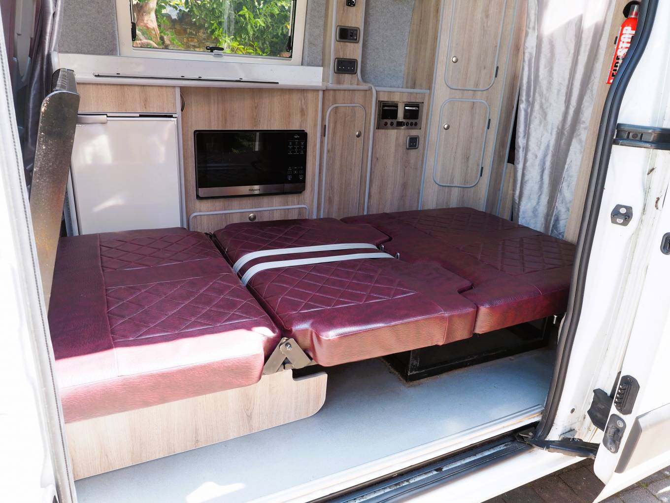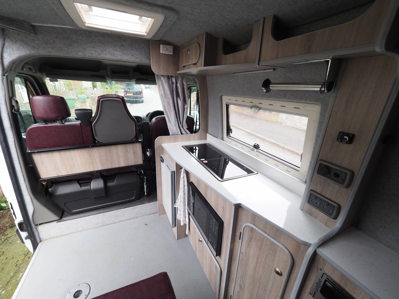 The van comes with a high specification including 6 speed manual transmission, power steering, cab air con, touch screen infotainment centre with sat-nav, cruise control, rear reversing camera and USB points in the cab and rear. The living area has been thoughtfully designed wikth a rock 'n' roll bed fitted with two travel belts to add to the three up front, two rear bunks, choice of two dining areas with removable table tops and a drop down bench seat allowing 4 to dine or sit around the table together. The kitchen facilities include a two hob gas burner, microwave and grill, sink and generous fridge and there is plenty of storage with cupboards, lockers and shelving throughout. Aside from the double rock and roll bed the two bunks to the rear, giving 4 berth accomodation can be dropped to leave as a single bed option or convert to a 1+1 diner.