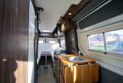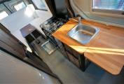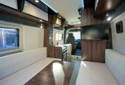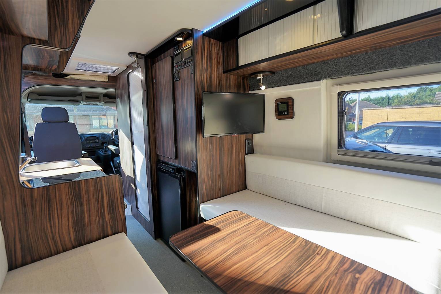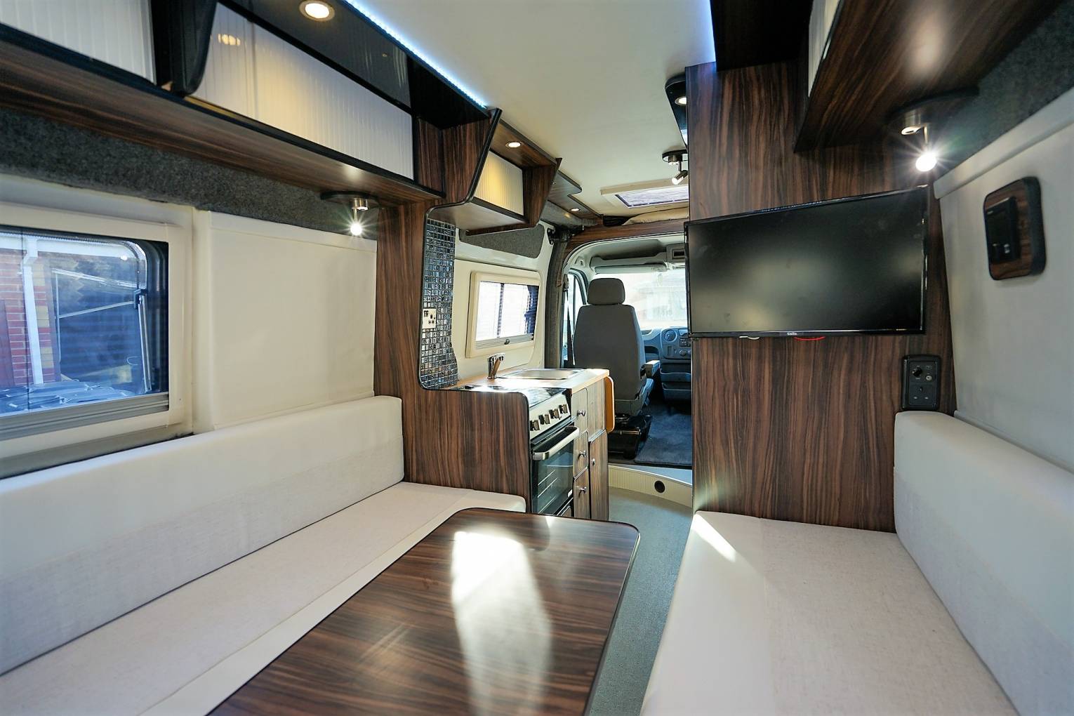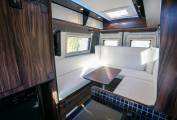The rear Lounge area has U shaped seating which easily converts to a double bed or two singles. Removable dining table, Storage Lockers above with tambour sliding doors.12/v240v TV/DVD fitted with TV aerial point and power sockets nearby. Truma Control unit located in the lounge area. Sky light above for extra Natural light. Led Strip Mood lighting above top storage lockers,