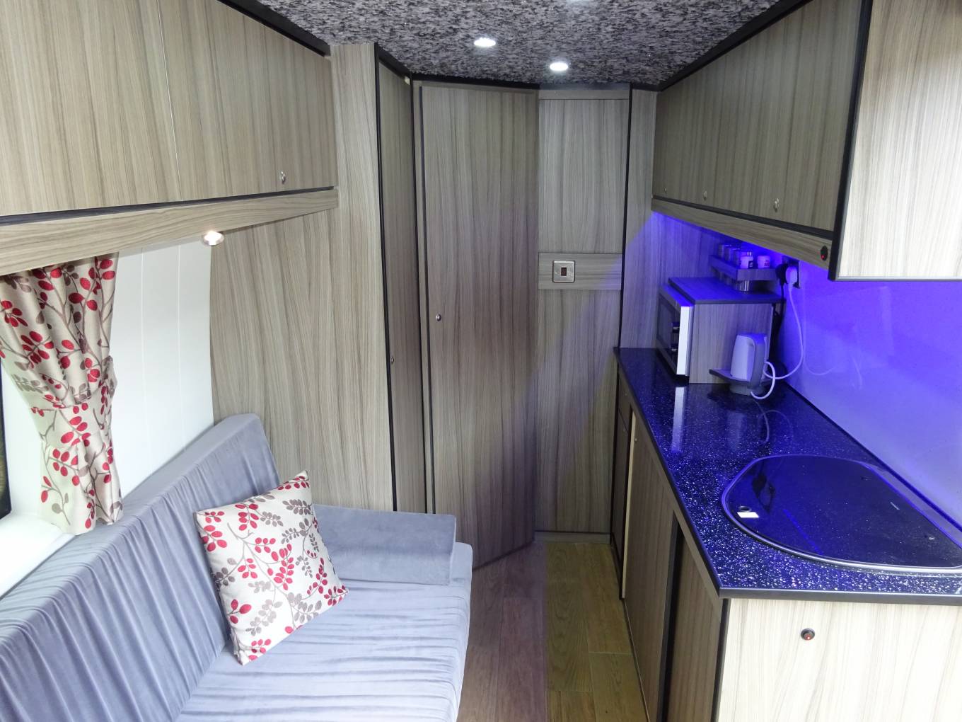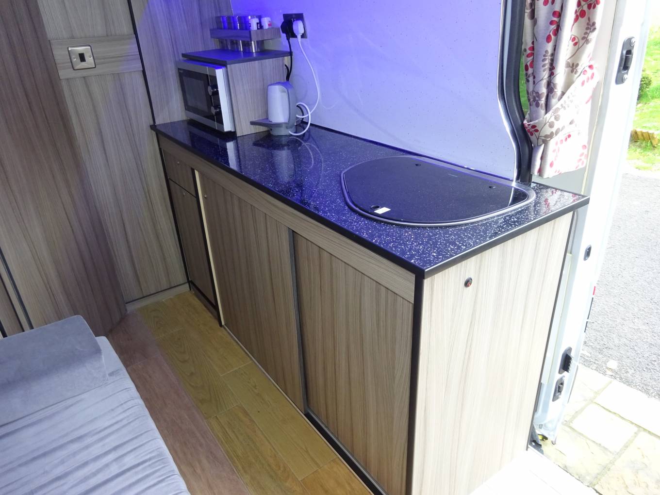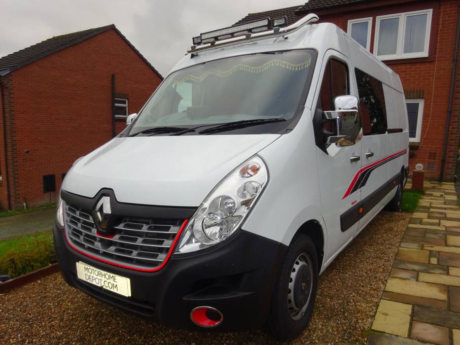 MotorhomeDepot.com Chester and Wirral present for sale this December 2017 (67 reg) Renault Master Camper Conversion. The layout is rear washroom, kitchen on the nearside by sliding door then the lounge, dining area and bed are at the front. The bed makes up by pulling the sofa frame out. There is storage under the sofa and when made the bed is approx 6' 2" long x 4' 1" wide. LED cieling and cupboard lights. There are 3 options of connection to the power supply, generator, mains power supply, 5000w and 12v-240v inverter. In the kitchen we have a microwave and kettle neatly mounted on the worktop with a Dometic sink and single gas hob. Plates and cutlery are included. Under the worktop, behind sliding doors are the fresh and grey water containers each holding 25 litres, along with the gas bottle. The 12v - 240v fridge is also belind a sliding door, with waste bin and shelving nearby. On the offside of the van is a full height wardrobe with hanging space. At the rear we have a generous size, very bright washroom. There is great shower space a corner sink and a porta potti that can be removed from the rear of the van. When the rear barn typre doors are opened you can see the washroom water tanks, shower tank is 75 litres and waste is 25 litres. The Propex Water Heater hold 10 litres and can stay warm for quite a while. The table and chairs in the photo of the rear section are included. They are stored neatly in thier own section at the rear. Hook up cales are included too. At the top of the rear storage is room for a windbreak, you can adapt the space to your own needs.