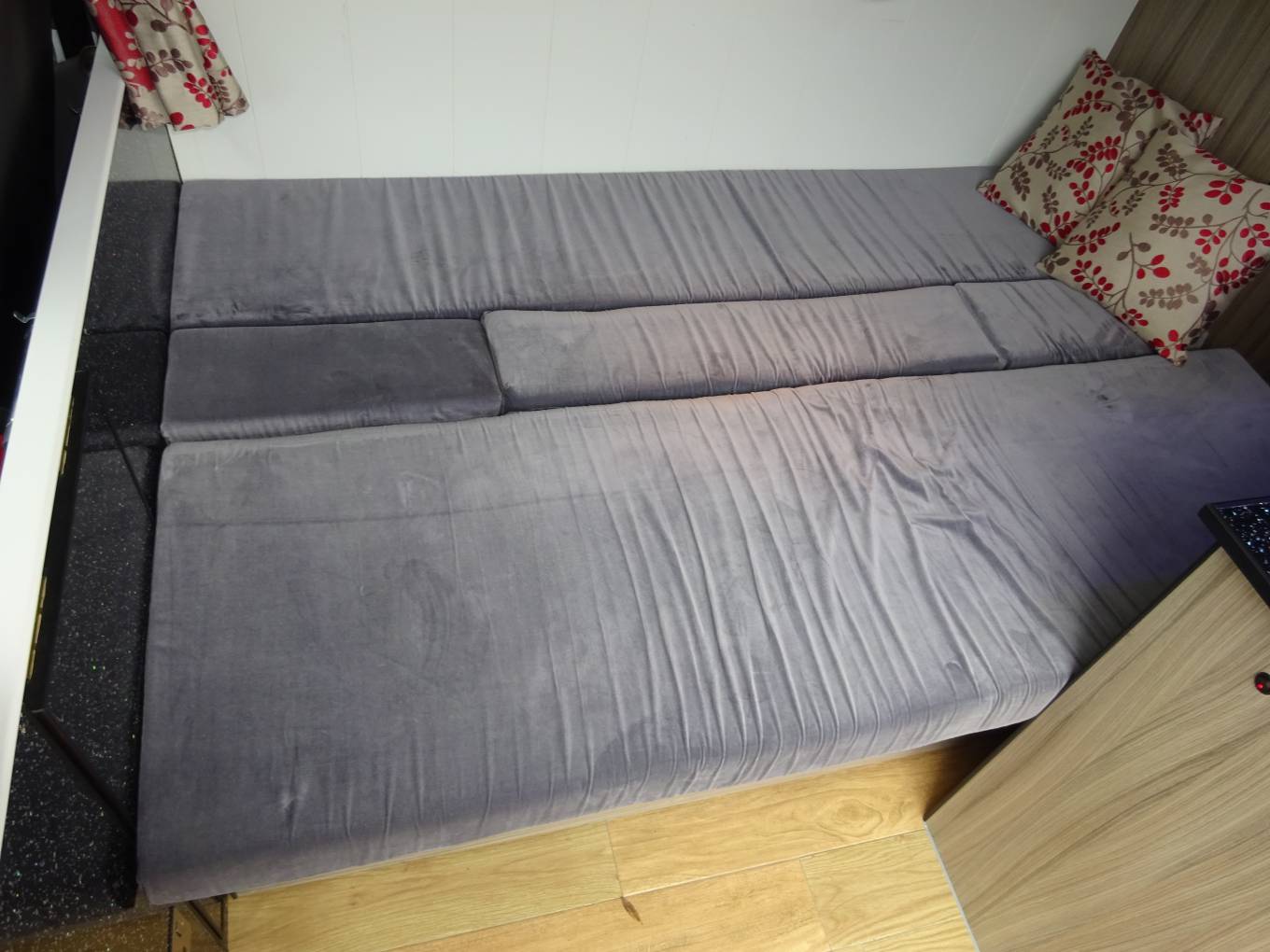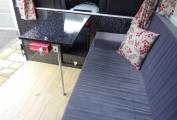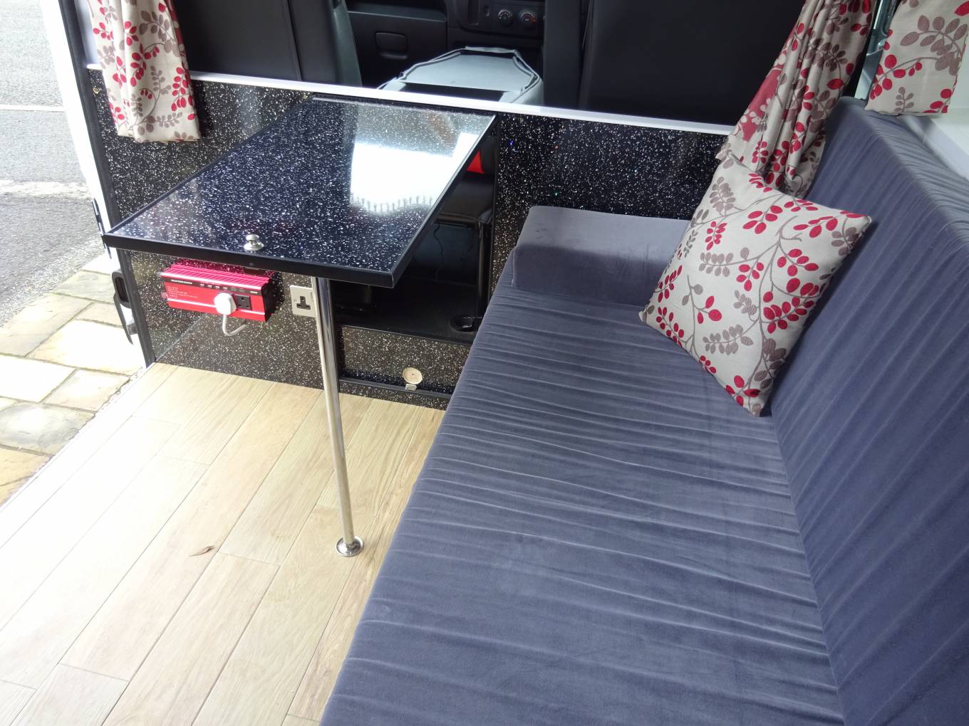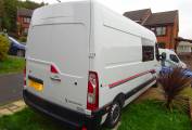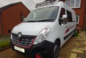 The base van is the Renault Master LM35 Business DCi powered by a 2298 cc diesel engine with a 6 speed gearbox. The van is believed to be under Renault Warranty until December 2021. In the cab we have smart red leather seats for 3, with 3 seat belts. The centre seat folds to make a useful tray. Reversing camera is included. (Dash cam and sat nav are not). Electric windows and mirrors are fitted. As is Air Conditioning, hands free bluetooth and multimedia steering wheel.Outside roof mounted lights and bar give a sporty appearance. An inflatable awning is also included in the sale.