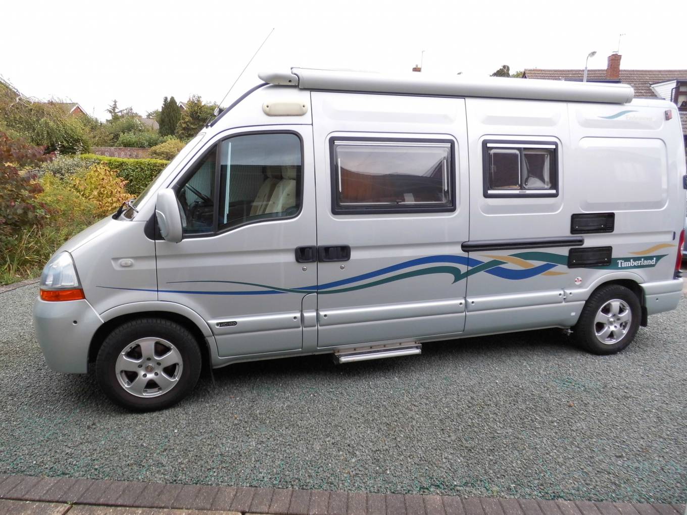 This a very nice clean example of the 2 berth Renault Master DCI120 Timberland Endeavour with low mileage. This motor home has a large sliding door for easy access and a large Omni electric step. It has alloy wheels with 4 new tyres, tow bar and reversing sensors. As you enter the motor home from the side there is a large seating / dining area which converts either into a large double bed or single bed. The seat itself is long making this ideal for a day bed. To the left of the entrance is the cab area with two swivel seats making this an ideal socialising area. To the right of the entrance is a single seat which also converts into a single bed. The dining area has two stand alone dining tables one large than the other. The smaller table also attaches to the kitchen to extend the worktop area. To the right of the entrance is a well equipped kitchen area comprising of a full oven, grill and 4 ring gas hob with glass lid, full size fridge with a freezer compartment which runs off gas,mains and battery and also a drinks cabinet. On the opposite side of the kitchen is a further work top area with a sink and drainer. There are both high and low level cupboards. There is lighting over the worktops and plug sockets on either side of the kitchen. A small fold away TV is mounted above the worktop. Moving to the rear of the motor home there is a washroom, consisting of a toilet, shower with screen and foldaway sink unit. There is a wardrobe in the washroom and rear coat hooks accessible from the back doors. Each window has fly screens and black out blinds, the driver and passenger windows also have blinds. The windscreen comes with a sun cover. Entertainment comprises of a TV and pioneer multi CD player. There is a smoke alarm, carbon monoxide detector and fire blanket. The beige upholstery and carpets makes this area light and airy. This motor home has air blow heaters.