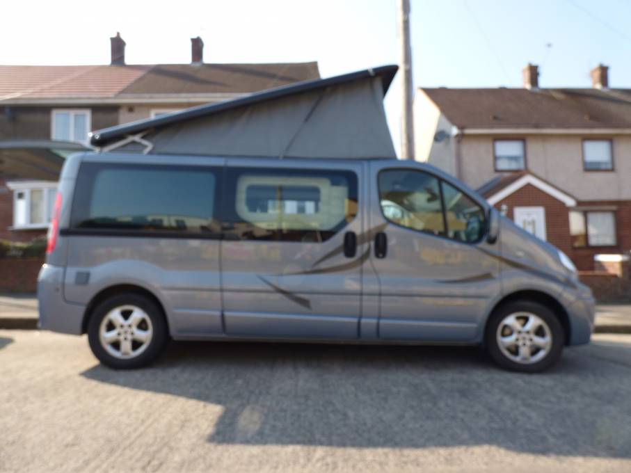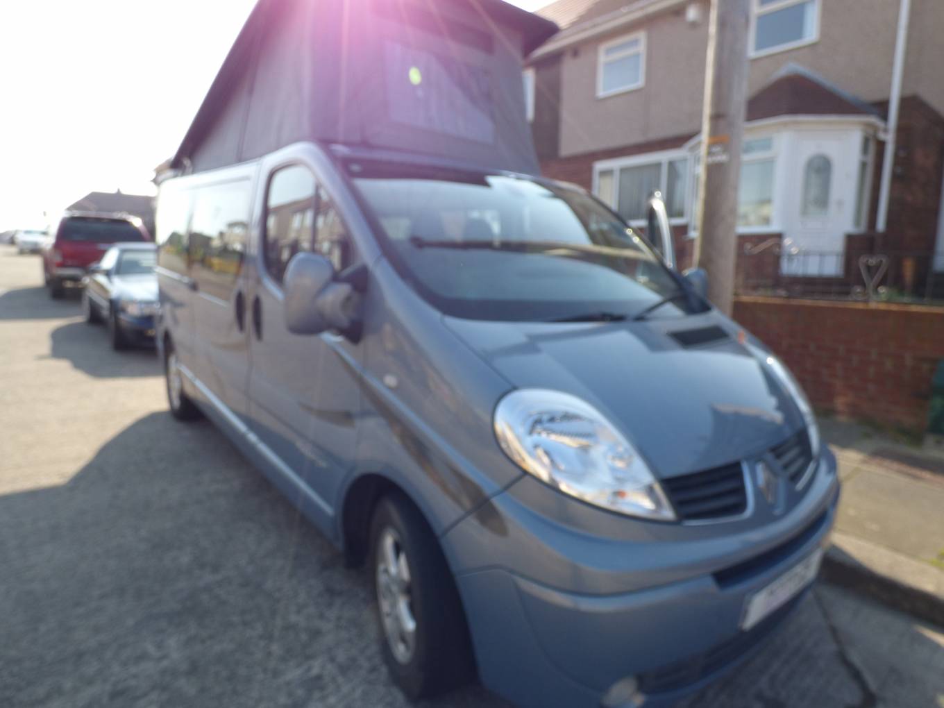 A very tidy below average mileage 4 berth camper conversion based on a LWB Renault Trafic Sport DCI and with 7 travelling seatbelts. The vehicle has plenty of storage space, LED lights and leather seating, rock and roll bed and sink/one ring hob combined. The removeable table is placed so four people could comfortably socialise and the pop top roof has two mattress toppers. Equipped with a Leisure battery and smart charger, diesel heater, fresh and waste water containers and reversing camera the vehicle is ready for adventure!