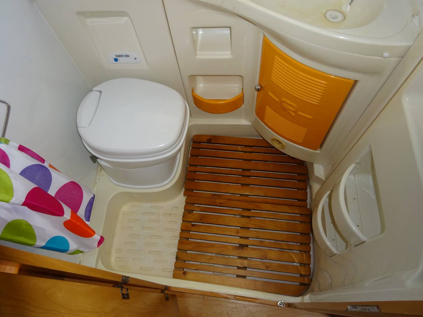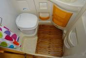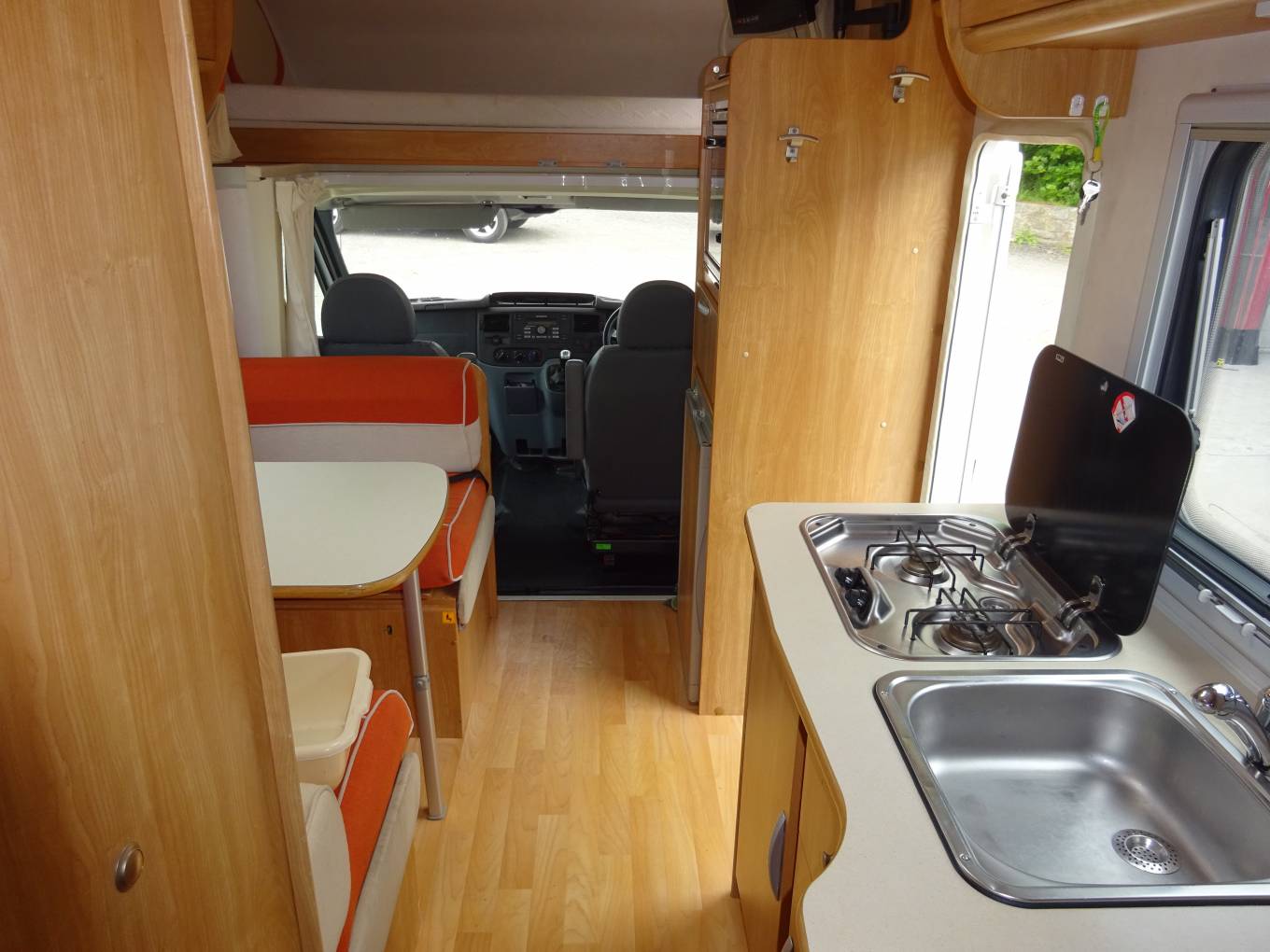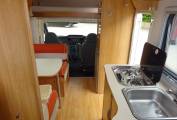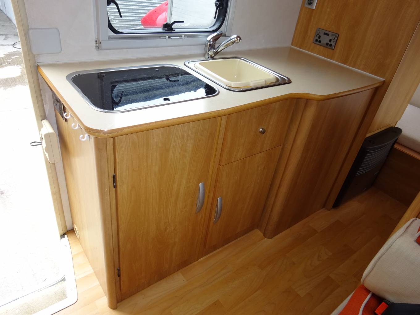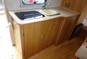 Side kitchen has a 2 burner gas hob, sink with mixer tap, fridge with freezer compartment, and an oven/grill. Heating and hot water from gas or electric. 100 litre fresh water tank.