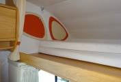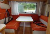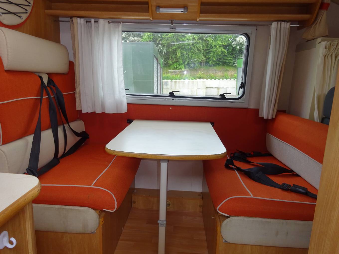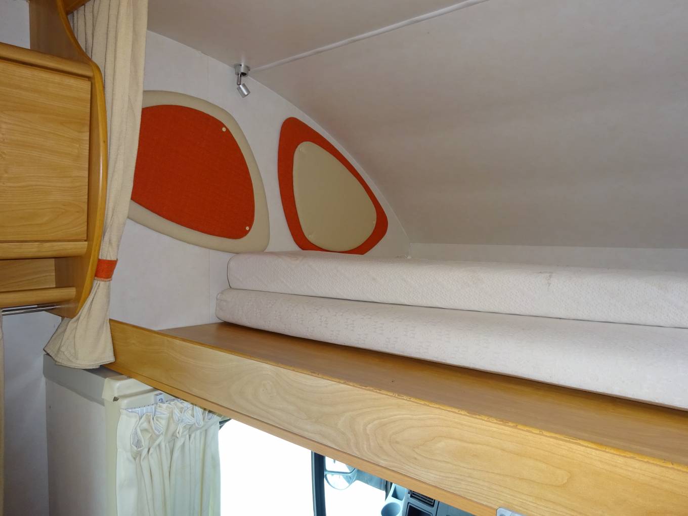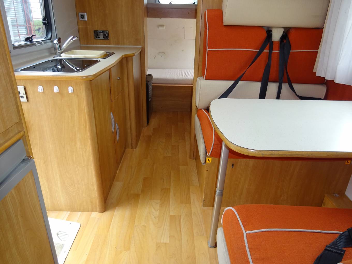 The layout of this motorhome offers a central lounge dinette area and kitchen with three sleeping areas. An over cab double bed, the dinette area converts to a double bed then at the rear there are two bunks beds. The lower bunk can be removed to give great garage space. This space could be used for bikes or sports equipment, perhaps even motorbikes subject to weight limits of course. The garage opening is approx 75 cm high x 129 cm high. The garage opens on both sides. The max weight of this motorhome is 3500 kg so can be driven on a normal car licence. Some LED lights have been fitted. Storage space is provided by a good sized wardrobe and other cupboards. In the dining area the 2 forward facing seats have 2 x 3-point seat belts, the 2 rear facing seats have lap straps.