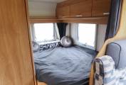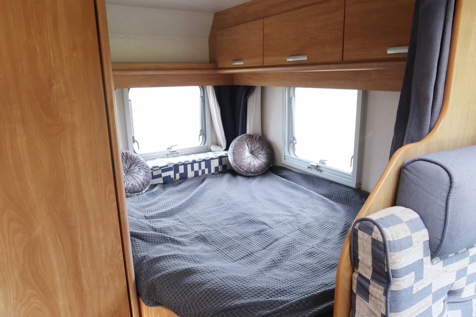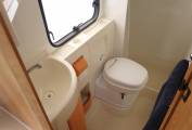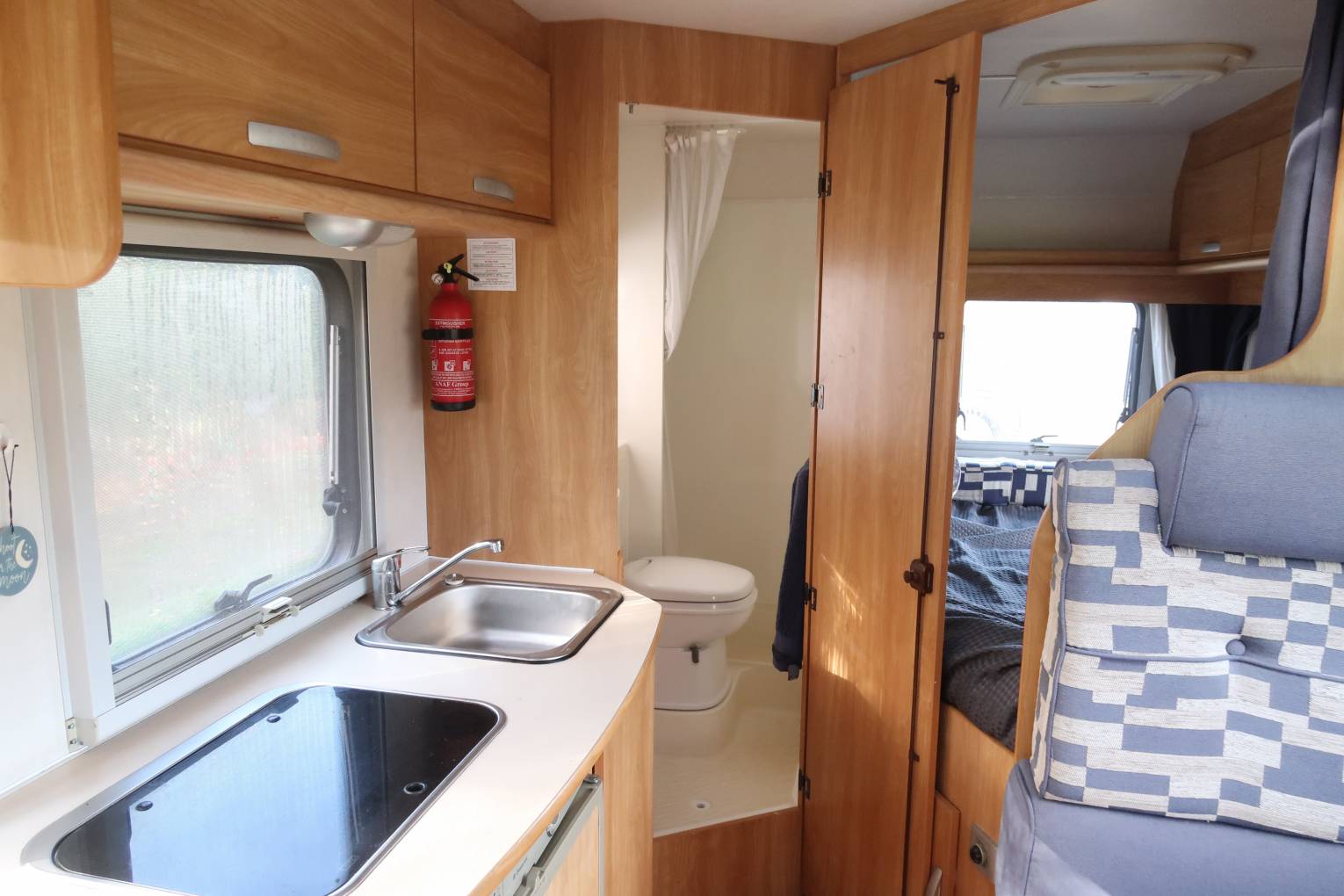 The internal layout consists of a rear fixed French bed with 2 overhead lockers providing plenty of storage space. Next to the bedroom is the washroom which has everything you need to keep yourself fresh on your travels. There is a spacious shower, a wash basin with a mixer tap, a Thetford cassette toilet and 2 bathroom cabinets, one of which is mirrored. A large window ensures that you have plenty of daylight to get yourself ready to go out.