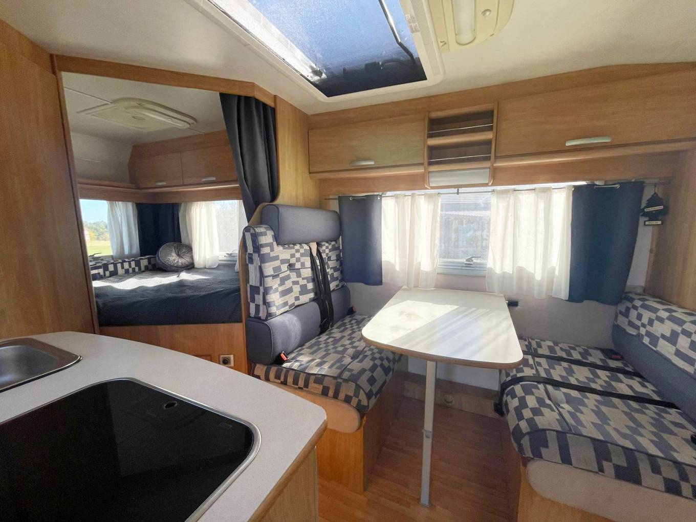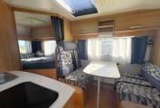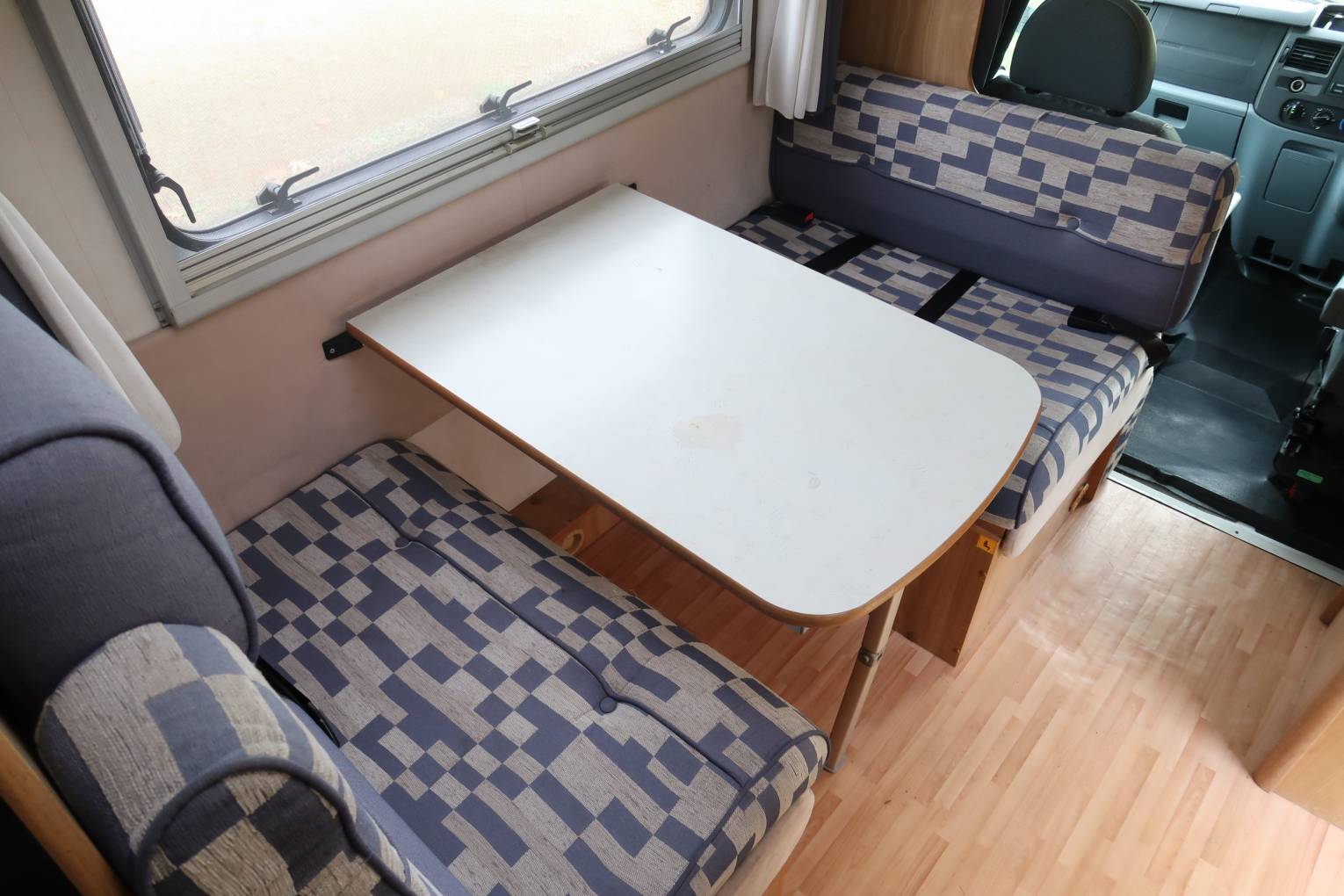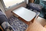 Cooking in the motorhome is based on the Continental way of life with a 2 gas burner hob and a microwave. There is a 3 way fridge with an ice box to keep your drinks cold and a stainless steel sink with a mixer tap. Opposite the kitchen is the lounge dinette. Here you have a forward facing 2 seater sofa fitted with 2 seat belts and a rear facing sofa with 2 lap belts. The dining table fixes on to a side rail and this can easily be removed if you need more leg room or prefer a more open feel. At bedtime the sofas come together to create a double bed.