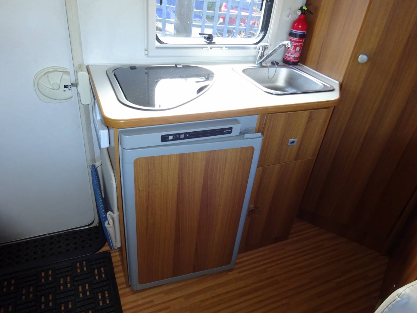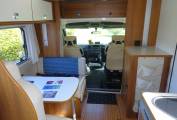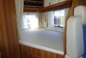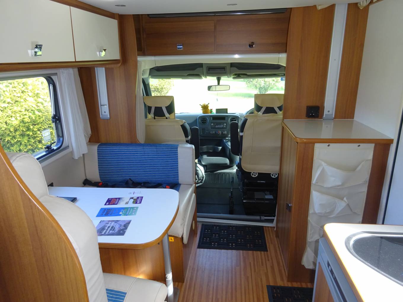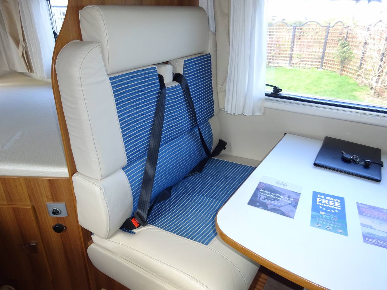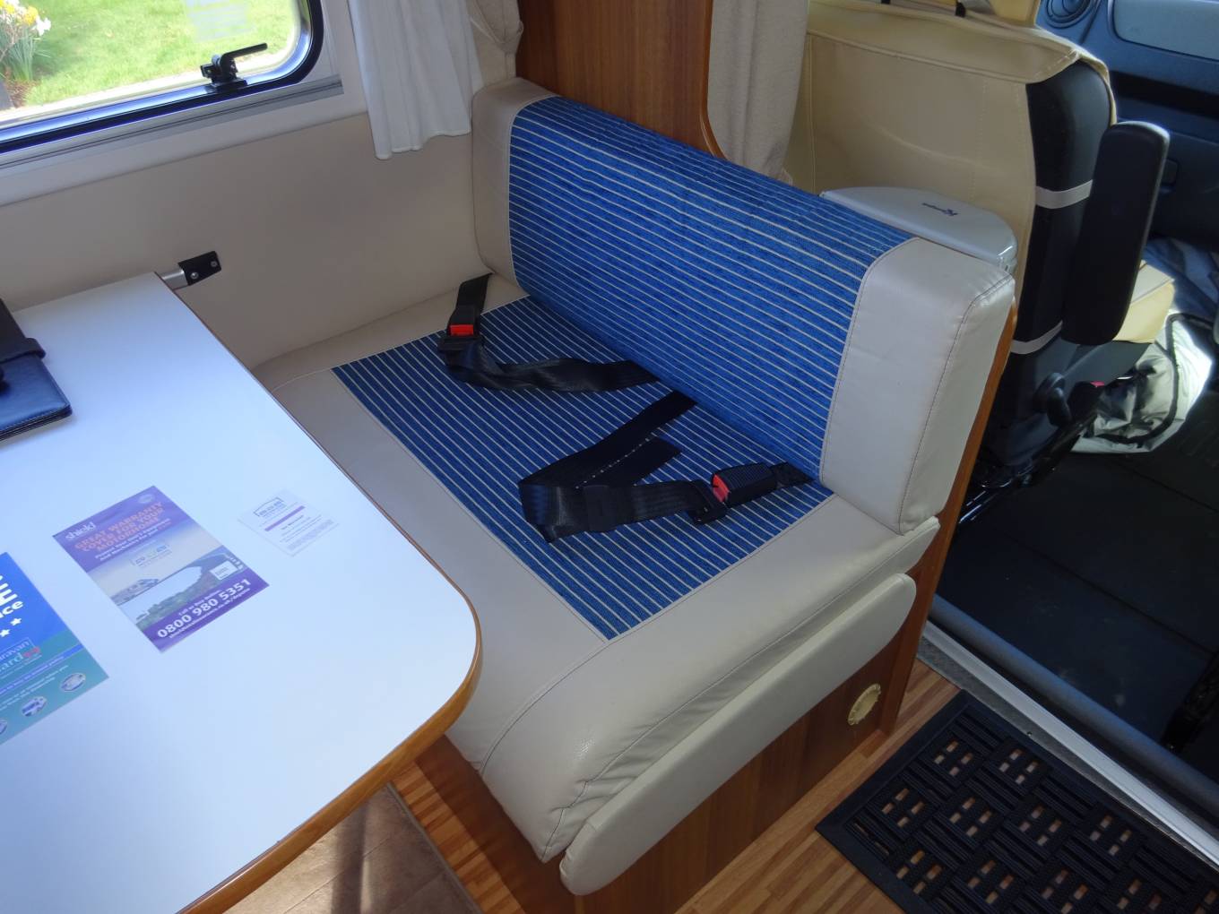 In the cab we have air conditioning, electric front windows and electric mirrors, bluetooth radio. There are drivers and passengers airbags. Seat covers are fitted to the drivers preference. The seats underneath are all good. An internal thermal screen is included and outer ones too. Lots of storage above the cab and the TV is mounted on a neat bracket there too. Outside we have a bike rack and a Fiamma awning. A safari room is included. An external locker provides useful storage. Two gas bottles are included. A towbar is fitted.