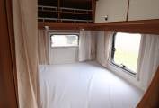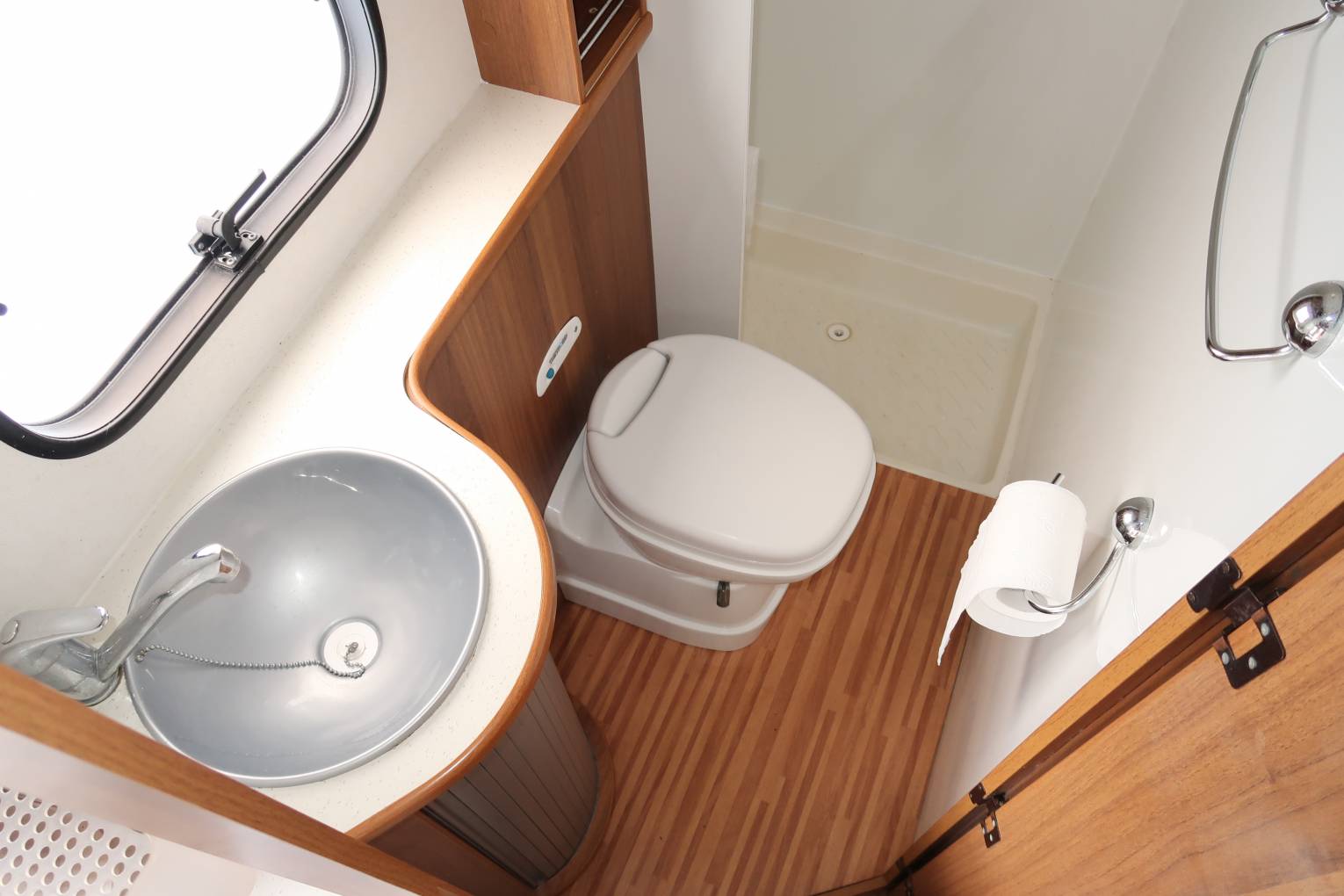 The mid-kitchen is equipped with a microwave, a 3 gas burner hob, a fridge with an ice compartment and a stainless steel sink with a mixer tap. Next to the kitchen is the stylish washroom which has a separate shower with a fold out screen, a wash basin with a mixer tap, a Thetford cassette toilet and a storage cupboard for your toiletries. A large window floods the washroom with daylight.