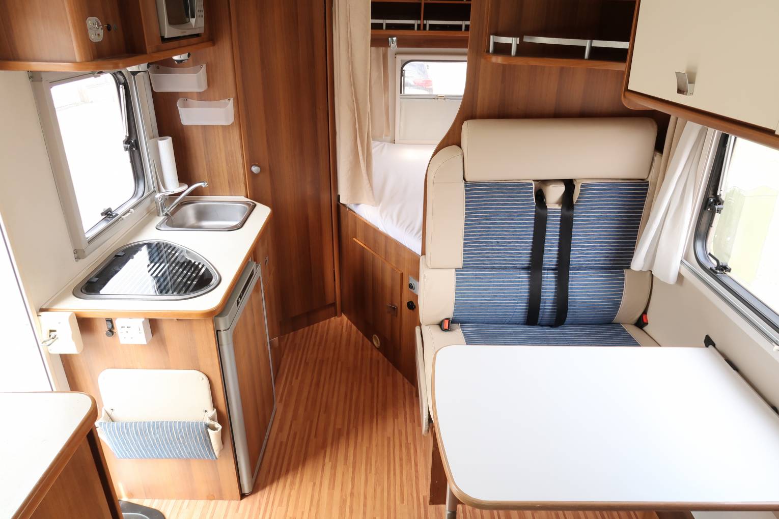 Behind the cab is the lounge dinette. The forward facing 2 seater is fitted with 2 seat belts and the rear facing sofa has 2 lap belts. The dining table fixes on to a side rail and if you want more space this can be easily removed and stored away. In the evenings the dinette converts into a double bed. Above the dinette is an electric drop down bed measuring 80 x 53 inches. When you wake up simply press the button and the bed stores neatly against the roof and frees up your floor space down below.