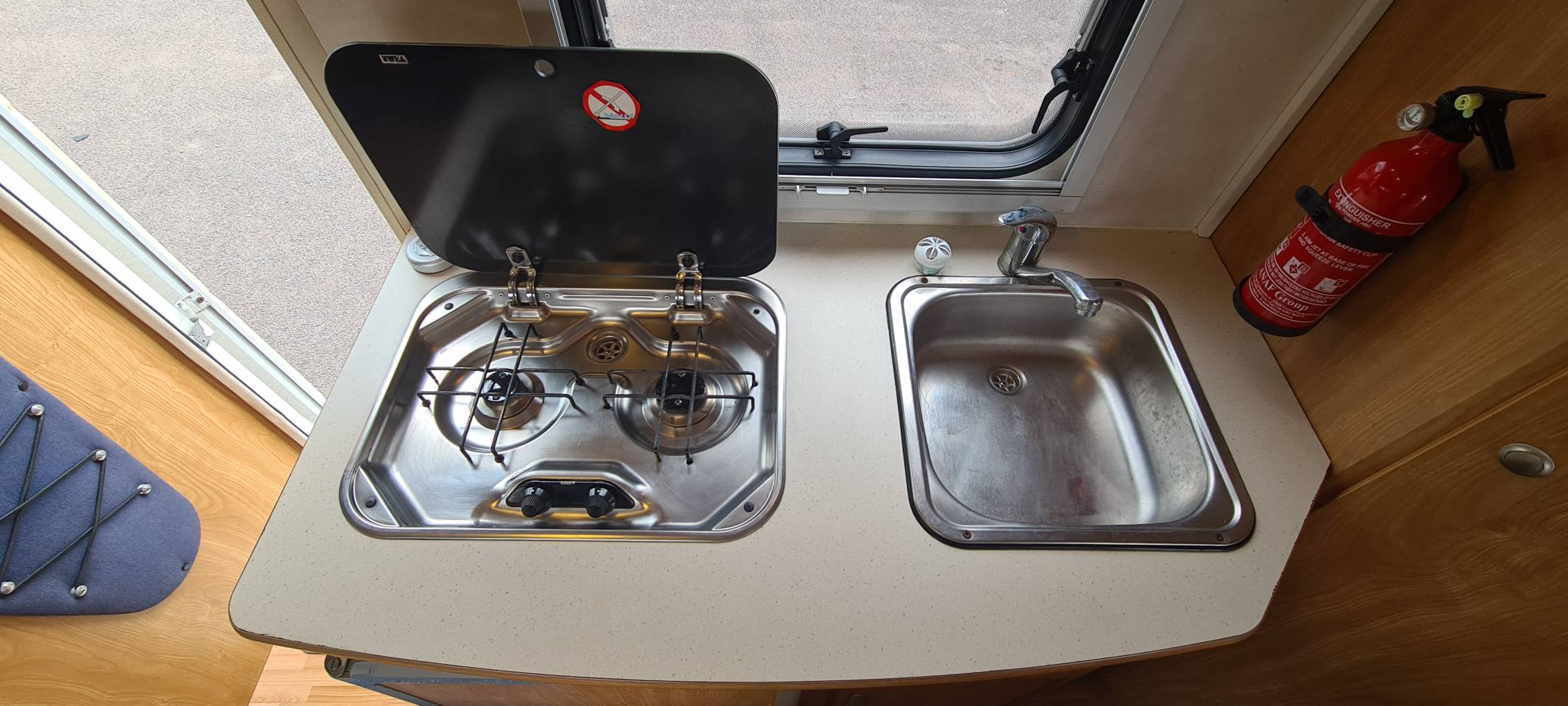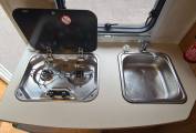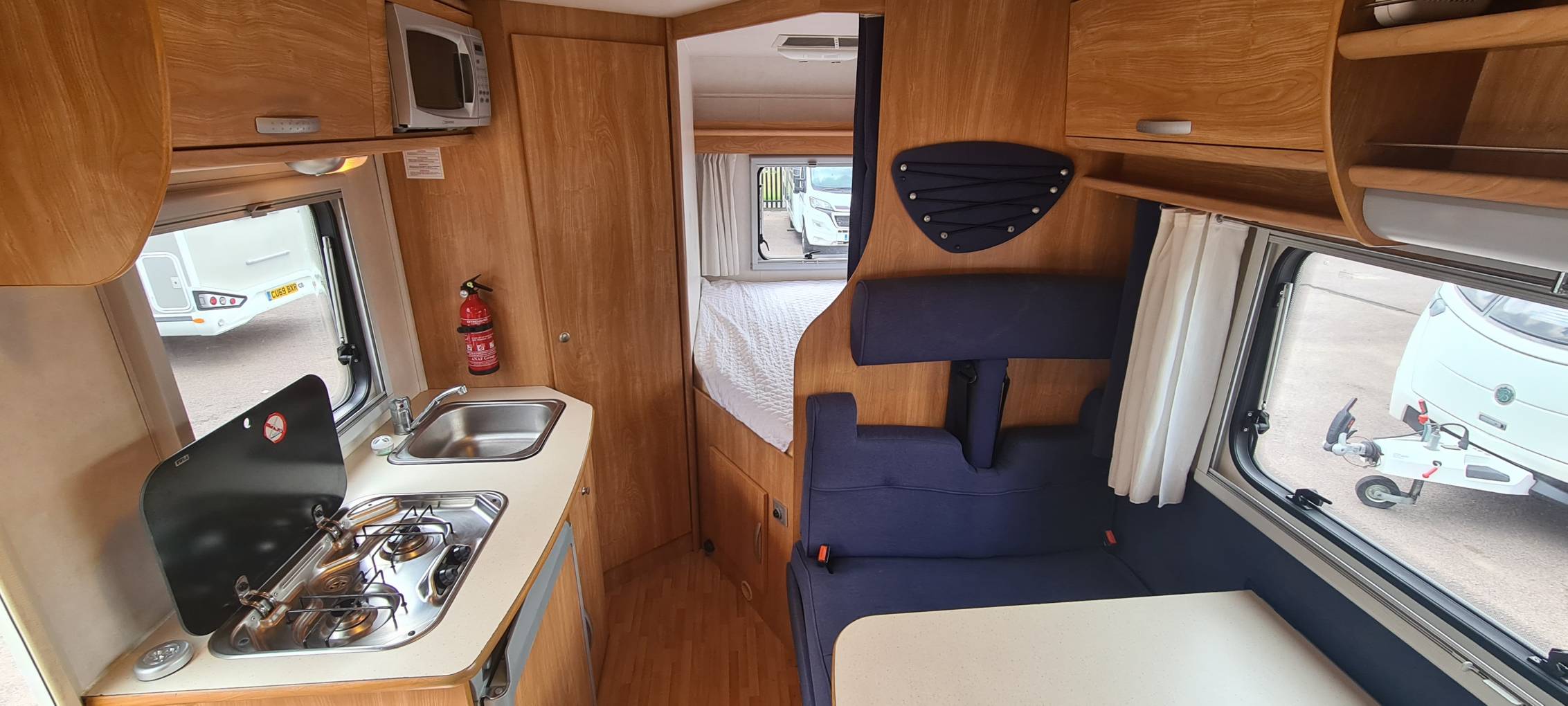 This 6 berth fixed french bed is a very popular layout for families or couples who require a little extra space. The dinette area turns into a further double bed with a 3rd double located above the cab. There are all the facilities you will require for a fun trip away, including a 2 burner gas hob, 3 way fridge and microwave. The washroom is extremely spacious with a separate shower to the rear.