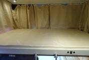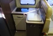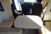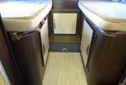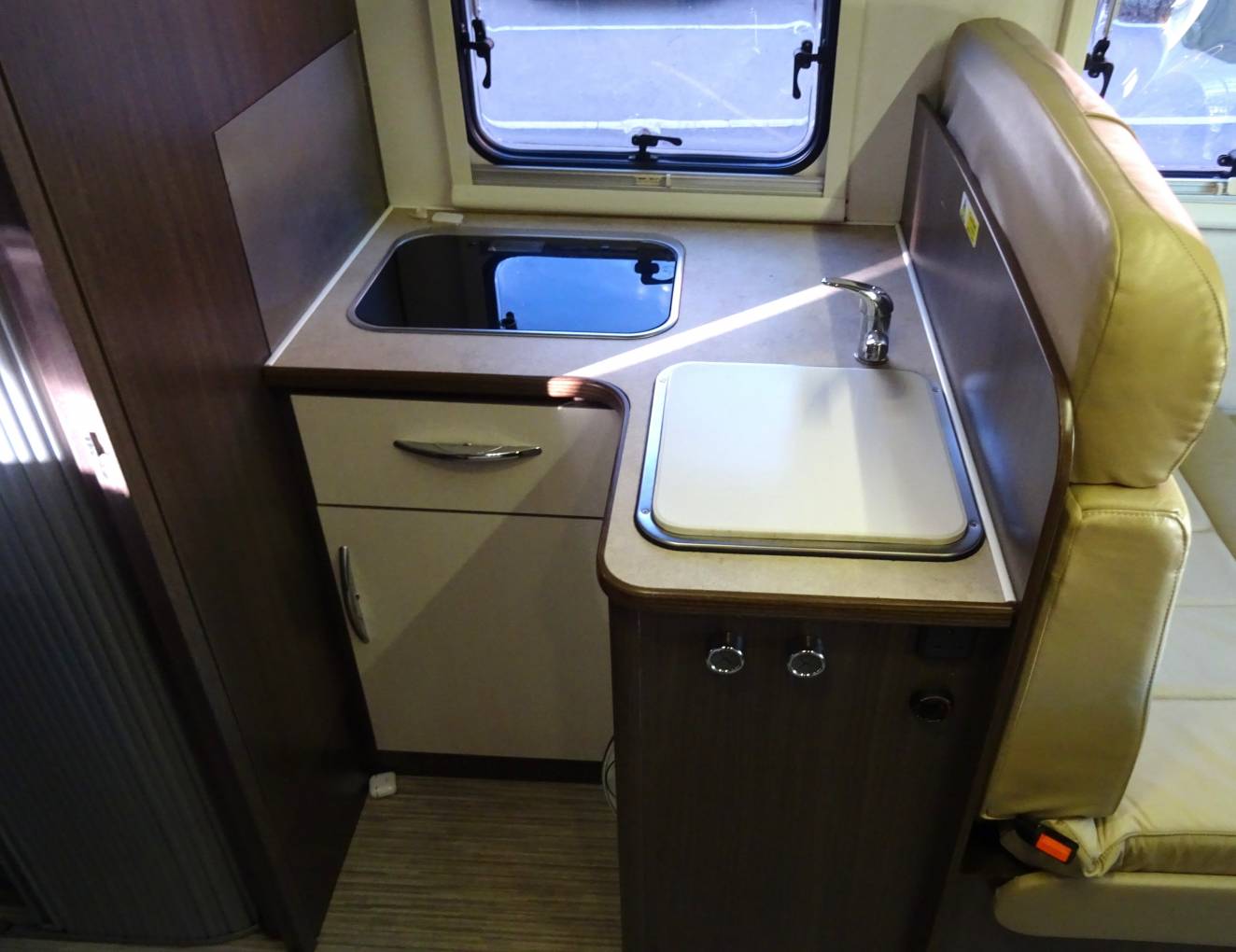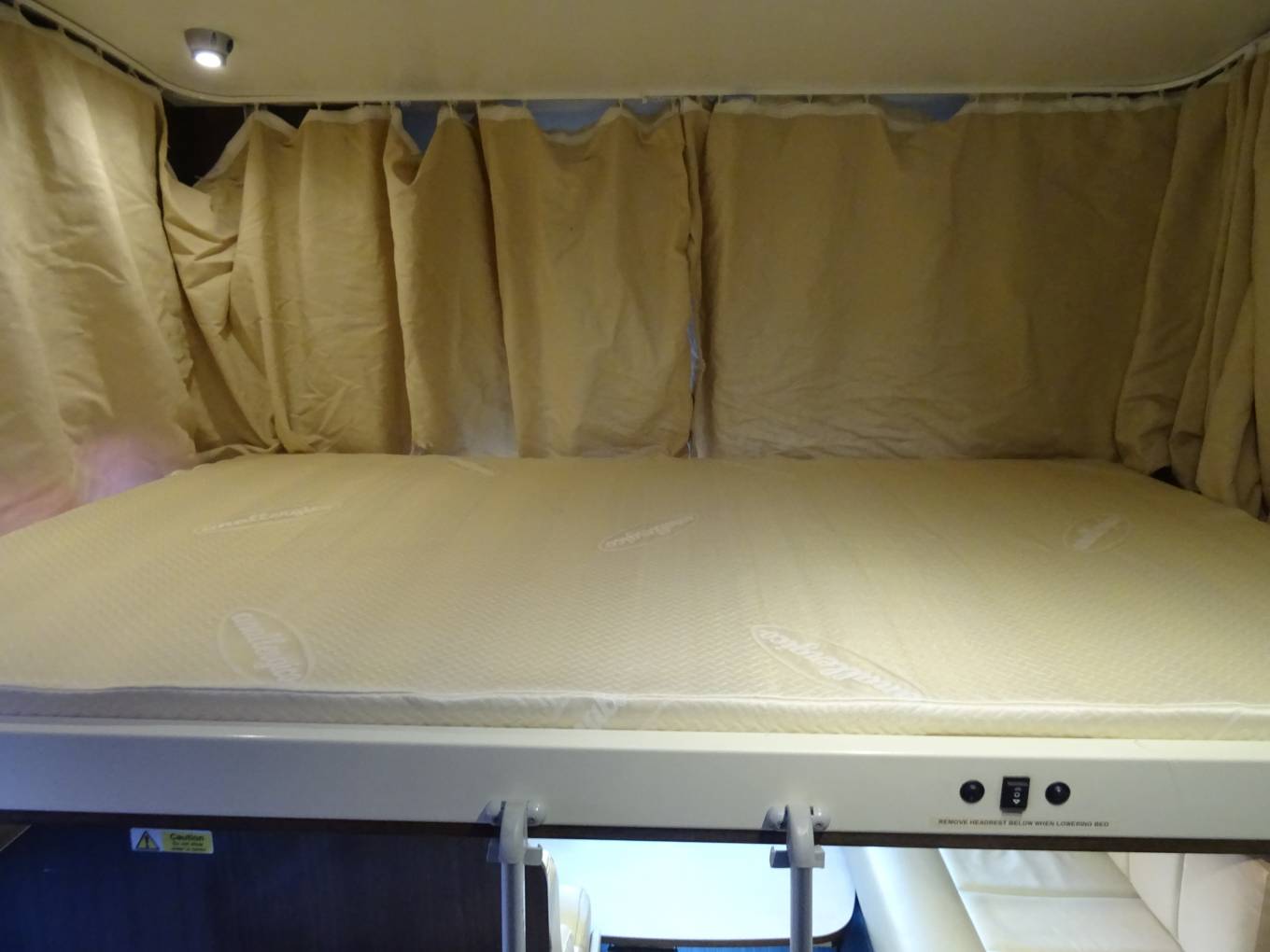Both Cab seats swivel to offer a comfortable lounge/diner. There are 2 belted forward facing leatherette seats and a small single with belt to the side. The fixed table is maneuverable and drops down for the lower single bed set up. There are 4 overhead lockers in this area (2 above cab) and a TV/DVD. AN ELECTRIC DROP DOWN BED can be lowered over this lounge at a fixed height and the ladder will be necessary.