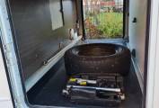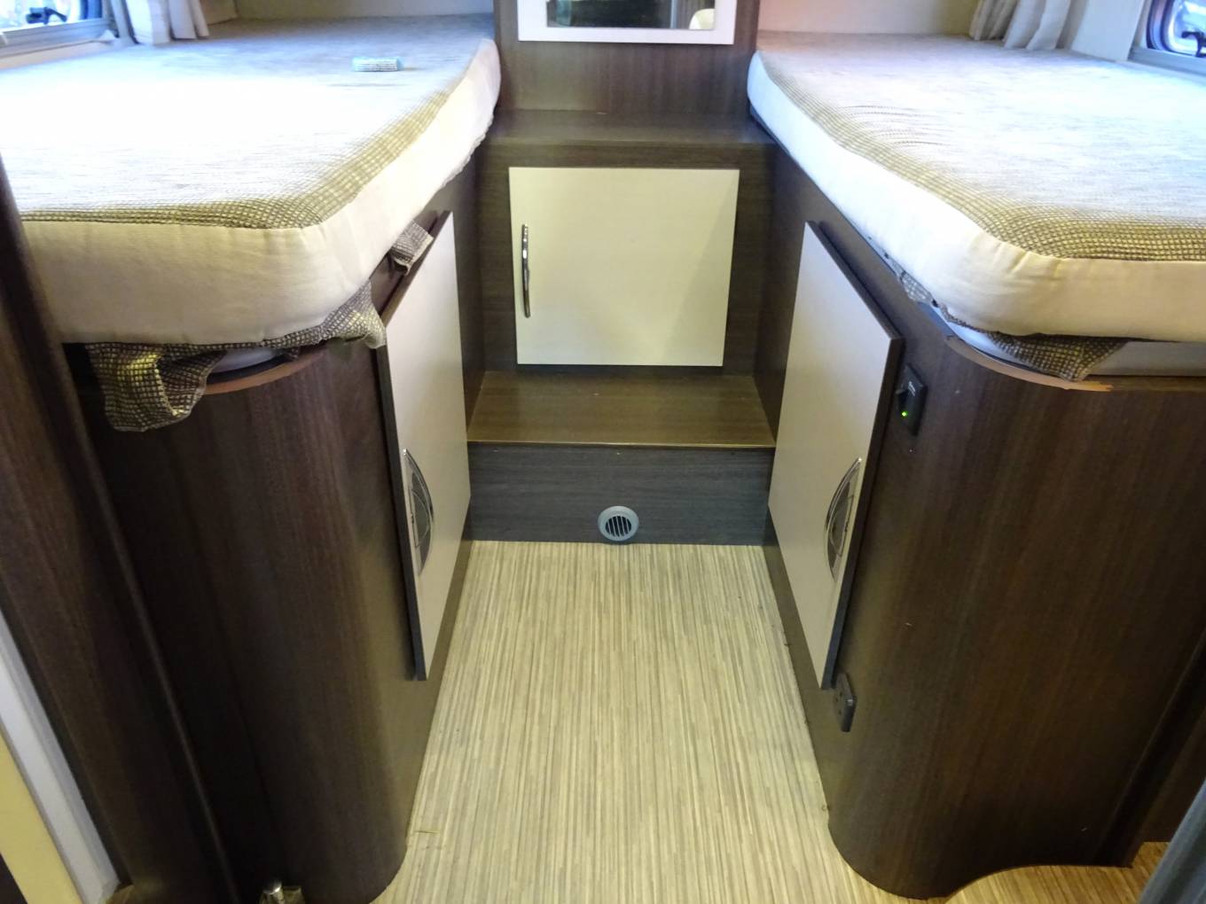 The kitchen area is well equipped with a small Smev oven/grill and Thetford 3 way fridge with freezer box. Opposite is a 2 burner gas hob, sink, mixer tap and good storage. Open the solid door and step through to the central wash room area, with separate shower, with solid bi-fold door, and separate toilet washroom with pull around solid concertina door. The rear bedroom has 2 separate singles (6 ft 6" x 2 ft 8") and can easily be made into a large double, there is a large central wardrobe, excellent under bed storage and access through to the large rear garage. Heating is Webasto (diesel). Hot water is on gas.