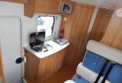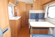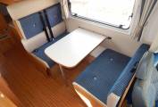 Step inside and the lounge or dinette area is in front of you, with two forward facing seats with 3-point seatbelts and two rear facing seats with lap-belts, a large dining table that drops down to make up a double bed in the evening. Upper aircraft style lockers, a tall unit that has a storage cupboard and mounted above is a Vision Plus TV with built-in DVD player.