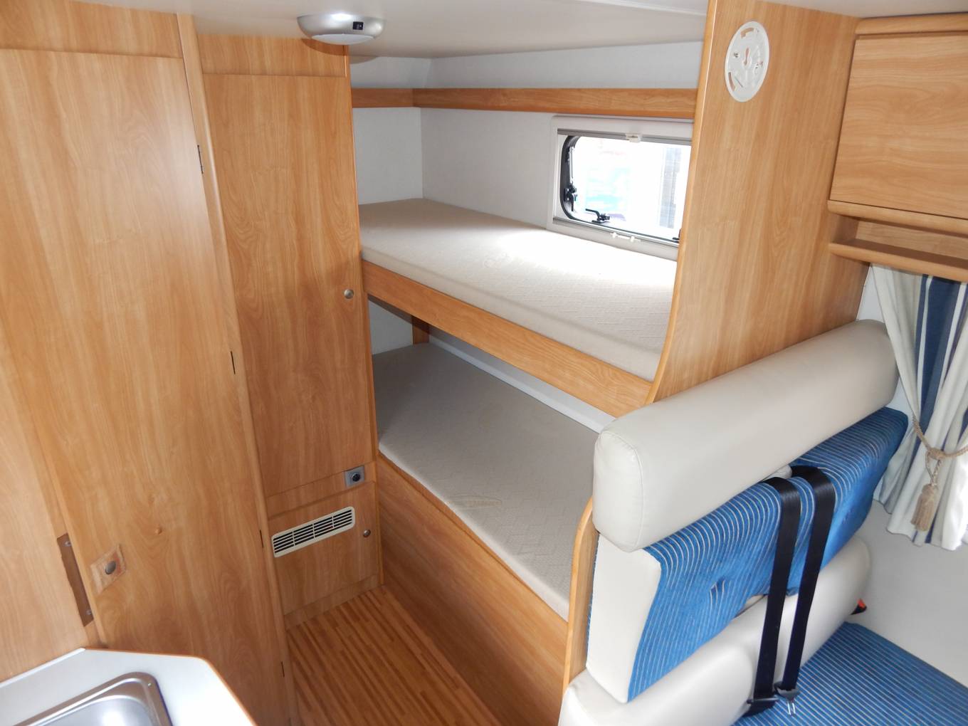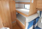 There are rear near side bunks, the top bunk has a window and there is a very large storage area under the bottom bunk.