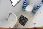 The washroom has a good sized shower tray, double shower curtain and a pull out shower hand-set. The washbasin has a cupboard below and a mirrored cabinet above, plus there is a Thetford cassette swivelling toilet with electric flush.
