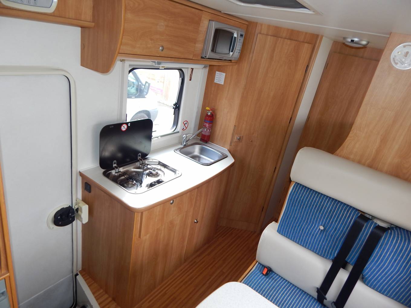 The kitchen has a round stainless steel sink with chrome mixer tap, a hob with two gas burners and a plug hole, a built-in microwave oven, a Thetford 3-way powered fridge with ice box and upper and lower cabinets to store away all of your holiday provisions.