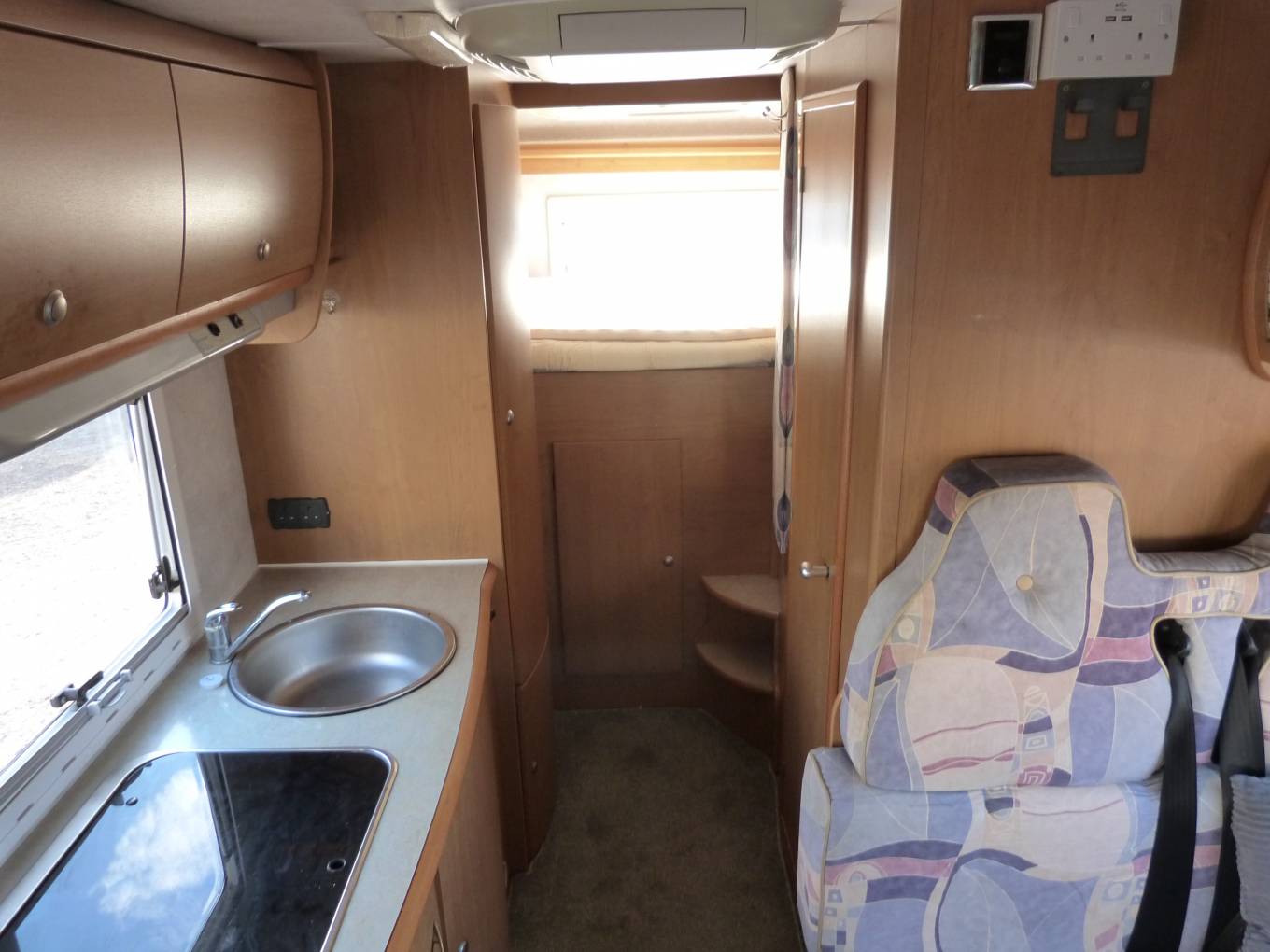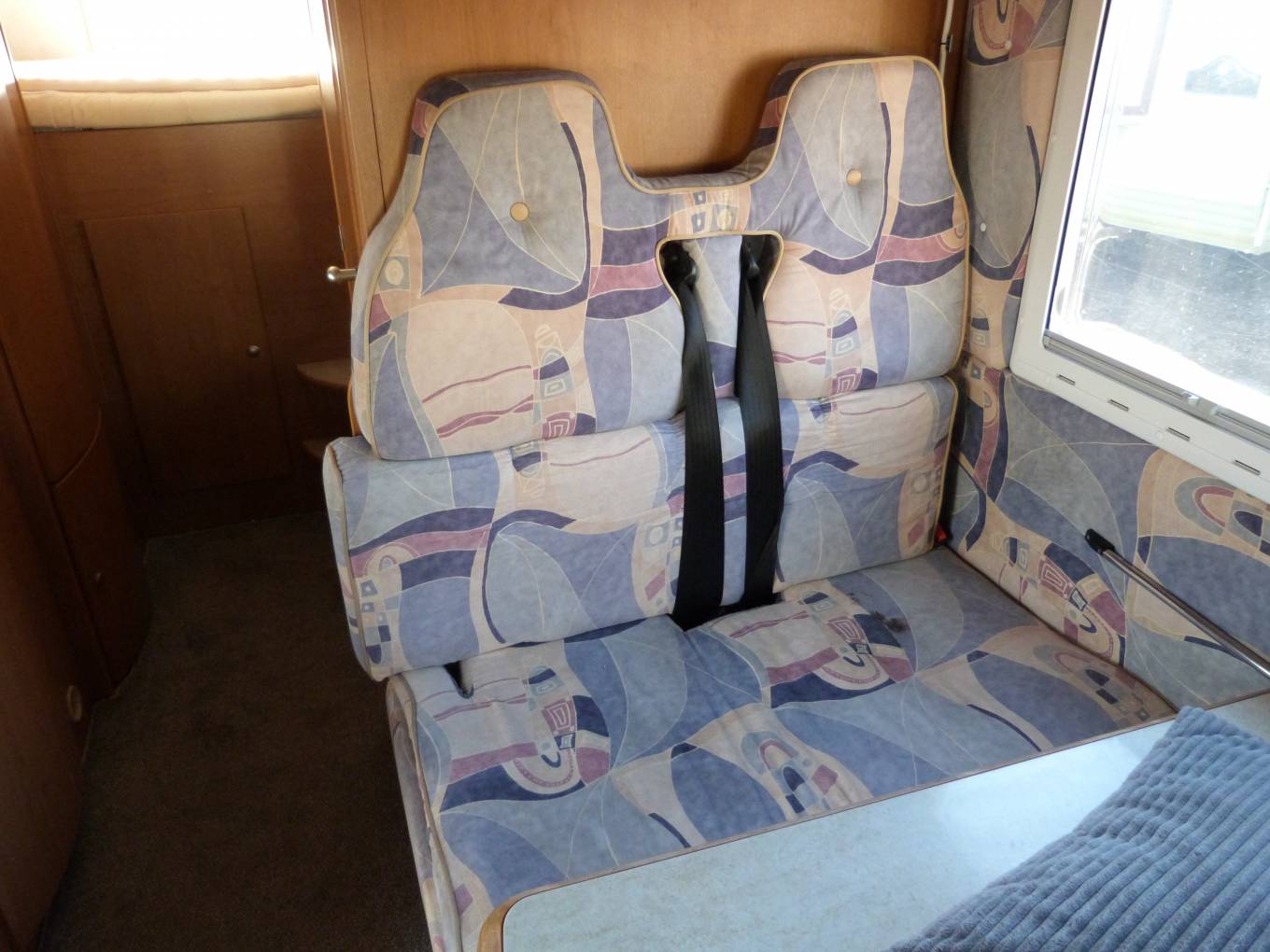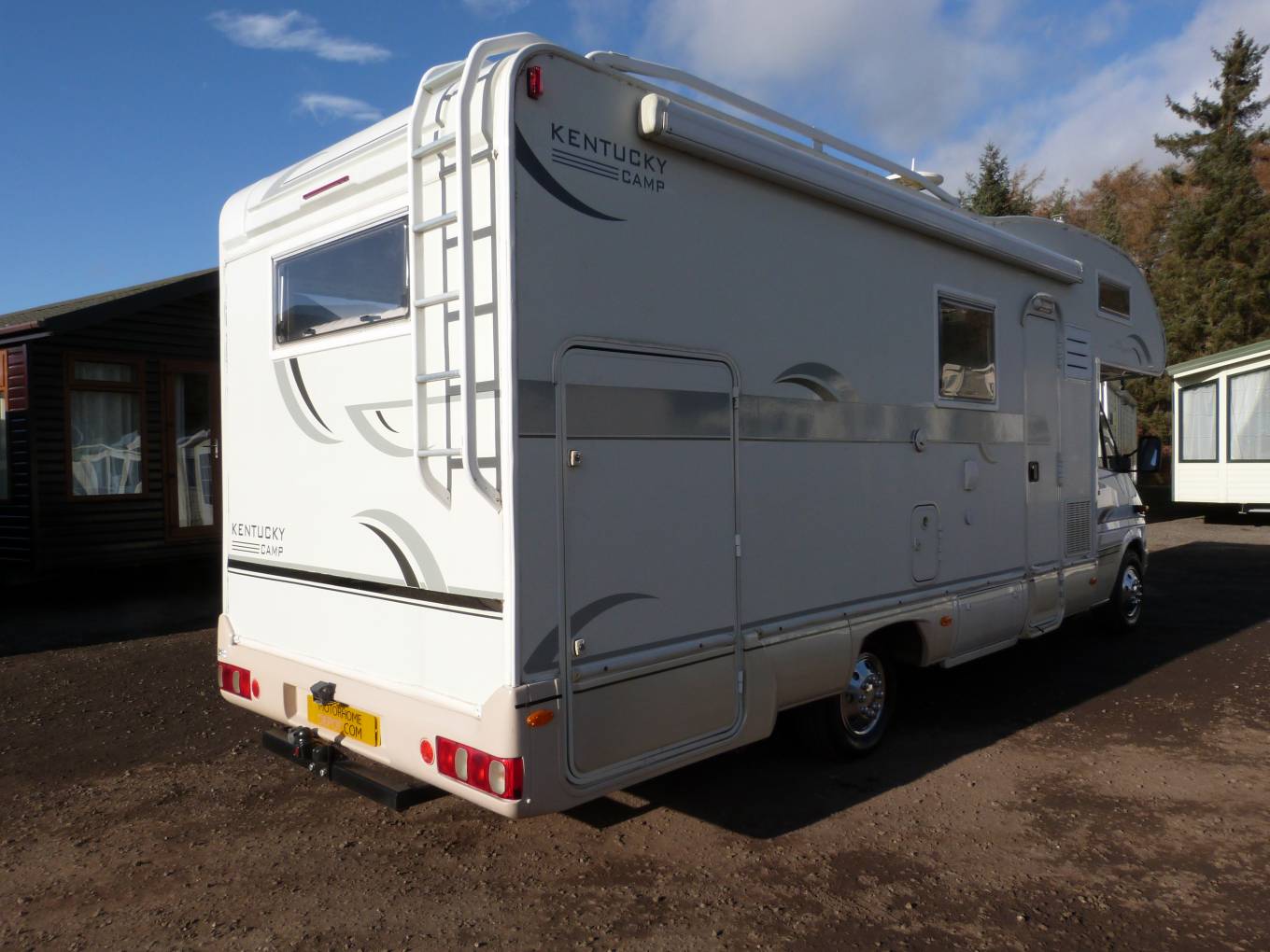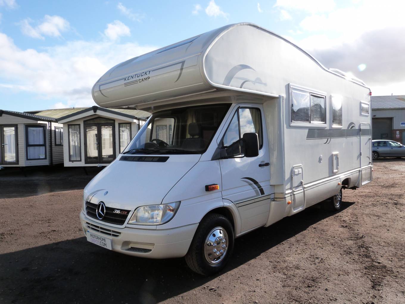 Call with any questions on 01423 609985. This 6 berth, coach-built Kentucky Camp 4, sits on a sits on the much sought-after Mercedes chassis. It was first registered in September 2004, has 2685cc engine and 5-speed manual gearbox. The standout features are the large rear garage, with doors on both sides, which easily holds motorcycles, road bikes or mobility scooters, so freeing up storage space inside plus anyone can drive this motorhome with GVW of 3500kg. The garage doors aperture opening is 33 inches x 50 inches and internal measurements are 35 inches x 80 inches, so can hold 2 full sized motorbikes. Internally at the rear you will find a double rear fixed bed measuring 6ft 10 inches x 4ft 3inches, with garage access underneath and plenty of storage cupboards above. This area benefits from a vanity mirror at the side and a skylight above which makes this end of the motorhome light and airy. Also, towards the rear you will find the washroom which contains a sink, toilet and shower with screen. The kitchen has a SMEV oven and grill, microwave, 3 gas burners plus sink, plus fridge, with plenty of storage space above and below the worktops. The dinette comfortably seats 4 people and includes 2 full seatbelts and 2 lapbelts, it also creates a bed measuring 6ft 3inches x 3ft. In the cab, you will find a radio/CD player, 5-speed manual gearbox and 2 swivel seats. The overcab bed measures approx. 6ft 8inches x 5ft which can lift easily to allow more head room when sitting in the cab area. It also has an onboard generator, solar panel awning/ canopy, satellite TV system (needs tuning), towbar and the GVW is 3500kg so anyone can drive it with valid driver’s licence. There are plenty of windows throughout which makes this motorhome very light and airy, and the upholstery is in good condition. The mileage is 41,403 and it will come with new 12-month MOT. This motorhome should be seen at the earliest opportunity and additional photos are available on request. It is situated in Worthing until early 2022, when it will be in North Yorkshire. Part-Exchanges are welcomed on this vehicle, for further information and photos please call us on 01423 609985 quoting Reference 170918