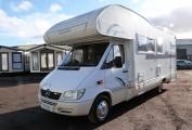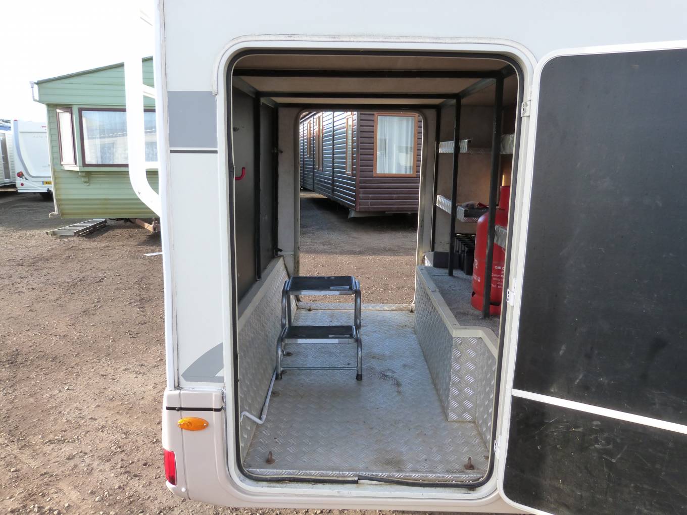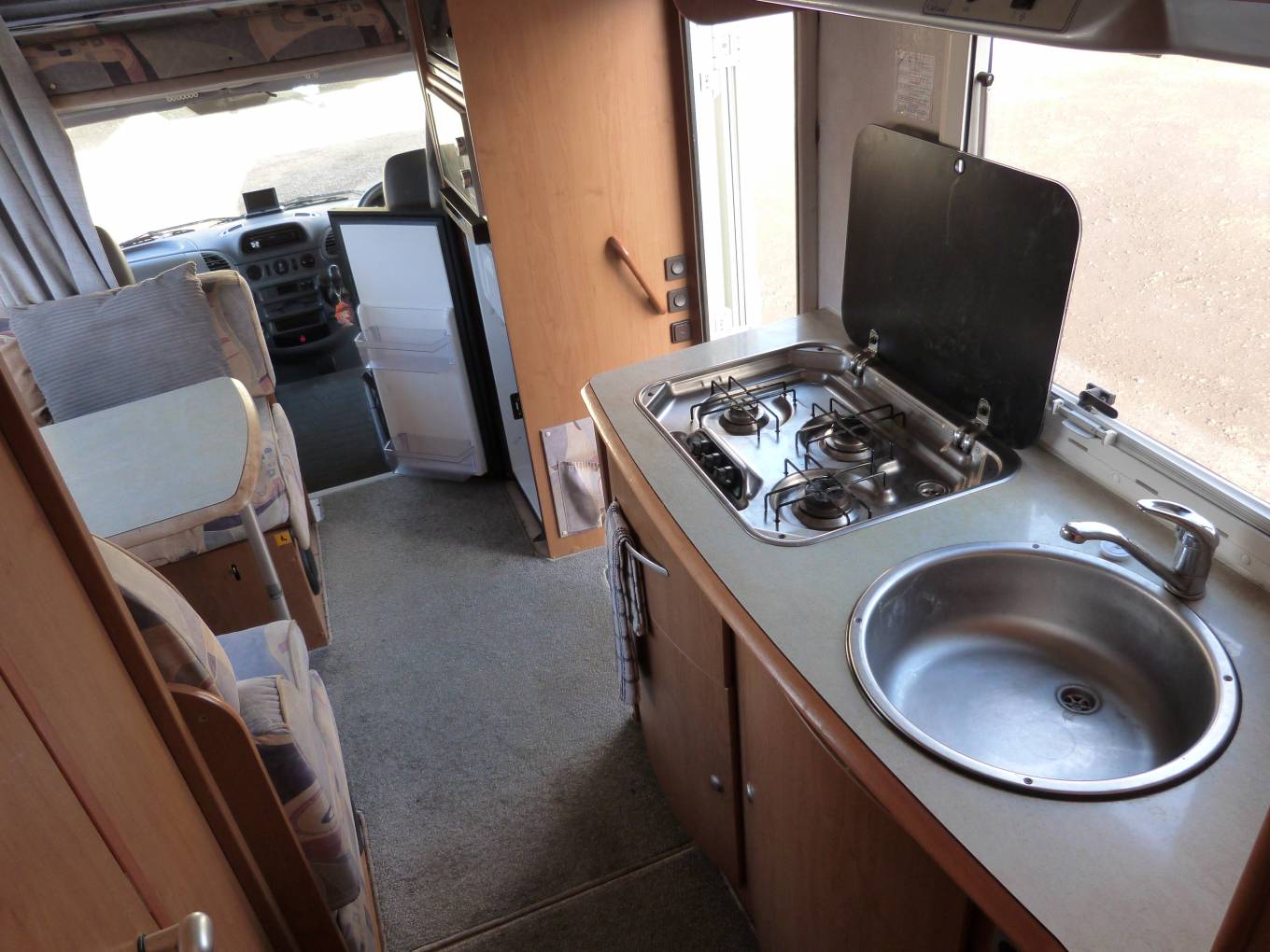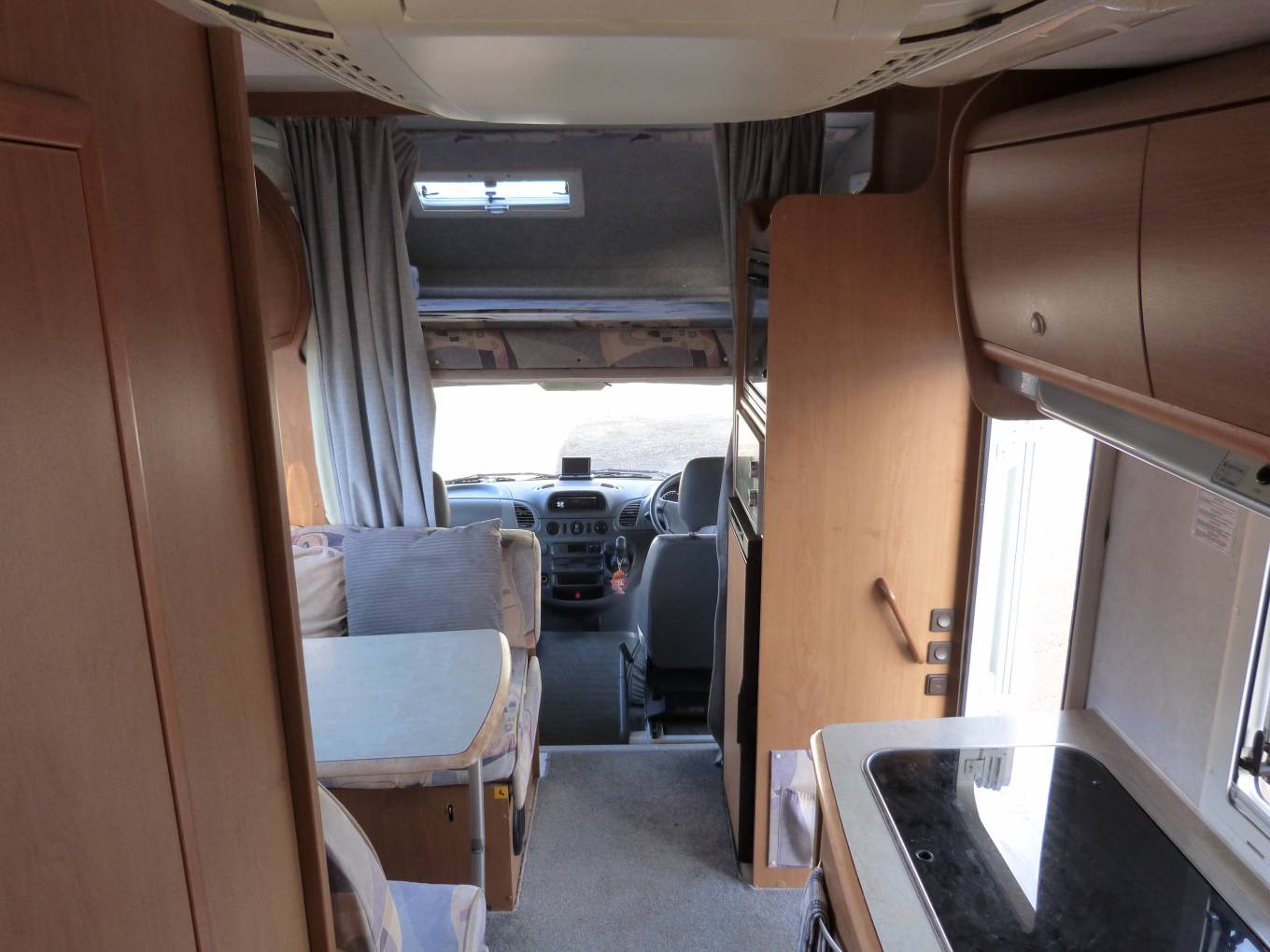 Call with any questions on 01423 609985. This 6 berth, coach-built Kentucky Camp 4, sits on a sits on the much sought-after Mercedes chassis. It was first registered in September 2004, has 2685cc engine and 5-speed manual gearbox. The standout features are the large rear garage, with doors on both sides, which easily holds motorcycles, road bikes or mobility scooters, so freeing up storage space inside plus anyone can drive this motorhome with GVW of 3500kg. The garage doors aperture opening is 33 inches x 50 inches and internal measurements are 35 inches x 80 inches, so can hold 2 full sized motorbikes. Internally at the rear you will find a double rear fixed bed measuring 6ft 10 inches x 4ft 3inches, with garage access underneath and plenty of storage cupboards above. This area benefits from a vanity mirror at the side and a skylight above which makes this end of the motorhome light and airy. Also, towards the rear you will find the washroom which contains a sink, toilet and shower with screen. The kitchen has a SMEV oven and grill, microwave, 3 gas burners plus sink, plus fridge, with plenty of storage space above and below the worktops. The dinette comfortably seats 4 people and includes 2 full seatbelts and 2 lapbelts, it also creates a bed measuring 6ft 3inches x 3ft. In the cab, you will find a radio/CD player, 5-speed manual gearbox and 2 swivel seats. The overcab bed measures approx. 6ft 8inches x 5ft which can lift easily to allow more head room when sitting in the cab area. It also has an onboard generator, solar panel awning/ canopy, satellite TV system (needs tuning), towbar and the GVW is 3500kg so anyone can drive it with valid driver’s licence. There are plenty of windows throughout which makes this motorhome very light and airy, and the upholstery is in good condition. The mileage is 41,403 and it will come with new 12-month MOT. This motorhome should be seen at the earliest opportunity and additional photos are available on request. It is situated in Worthing until early 2022, when it will be in North Yorkshire. Part-Exchanges are welcomed on this vehicle, for further information and photos please call us on 01423 609985 quoting Reference 170918