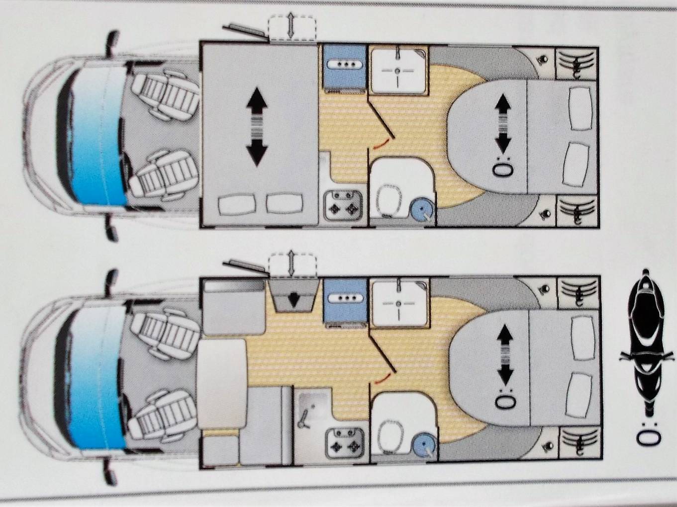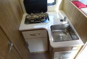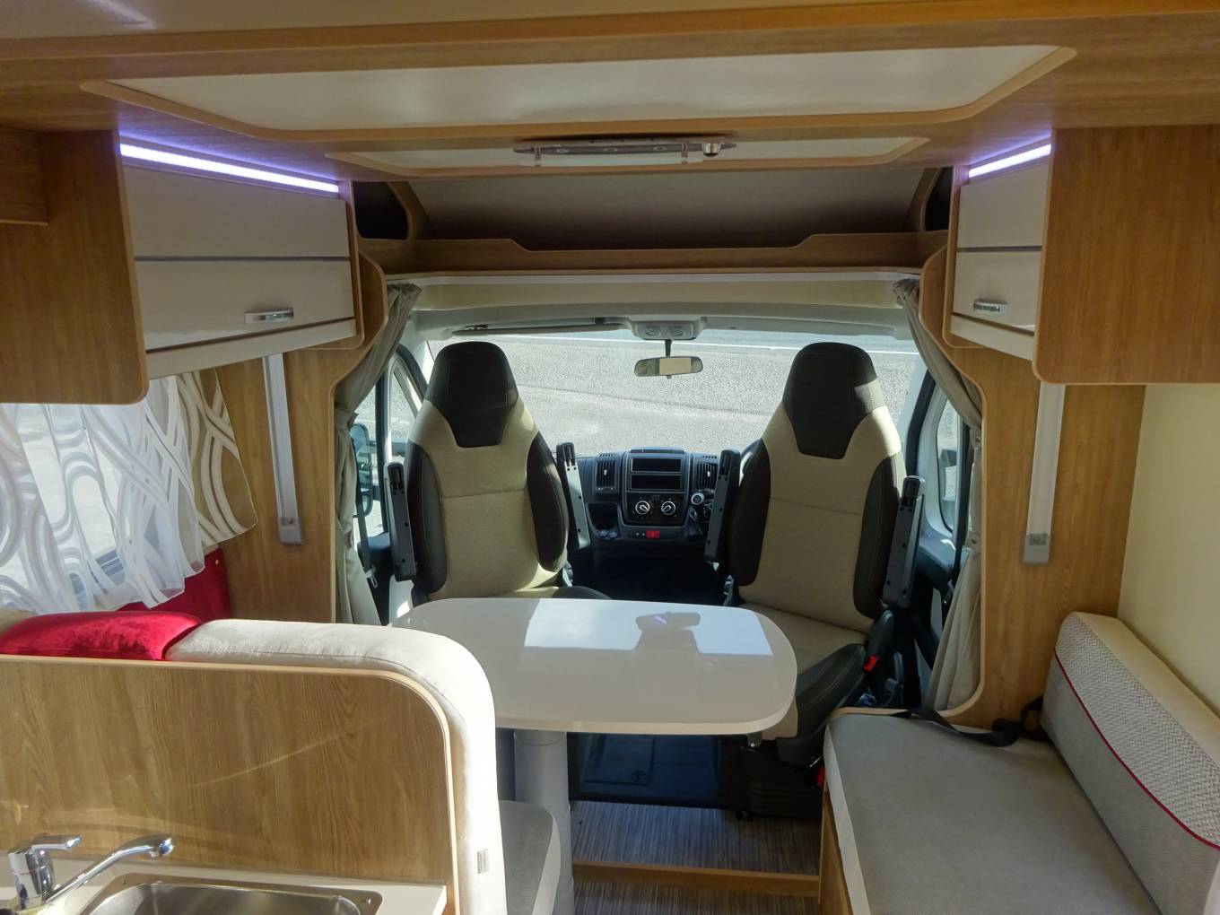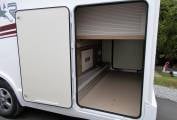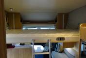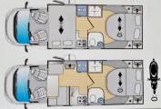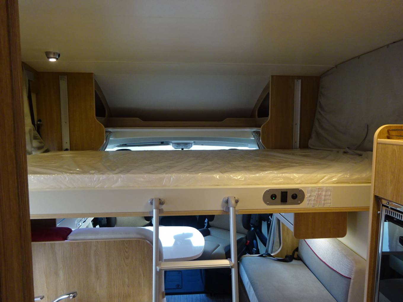 A front roof mounted double bed which is also electrically controlled and a front lounge area that converts into a small double bed.