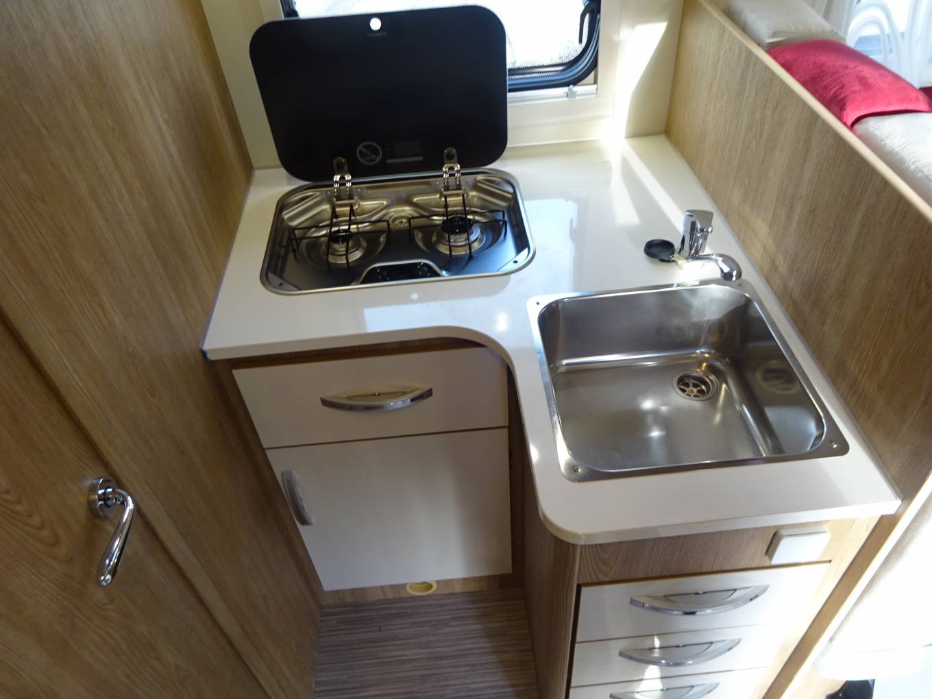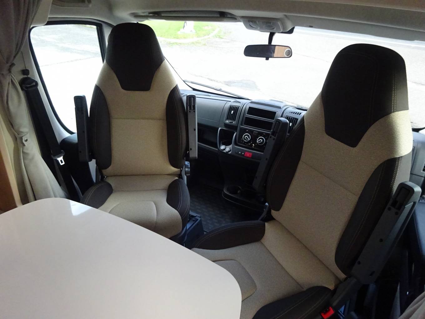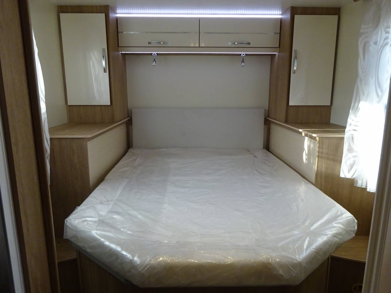 A front roof mounted double bed which is also electrically controlled and a front lounge area that converts into a small double bed.