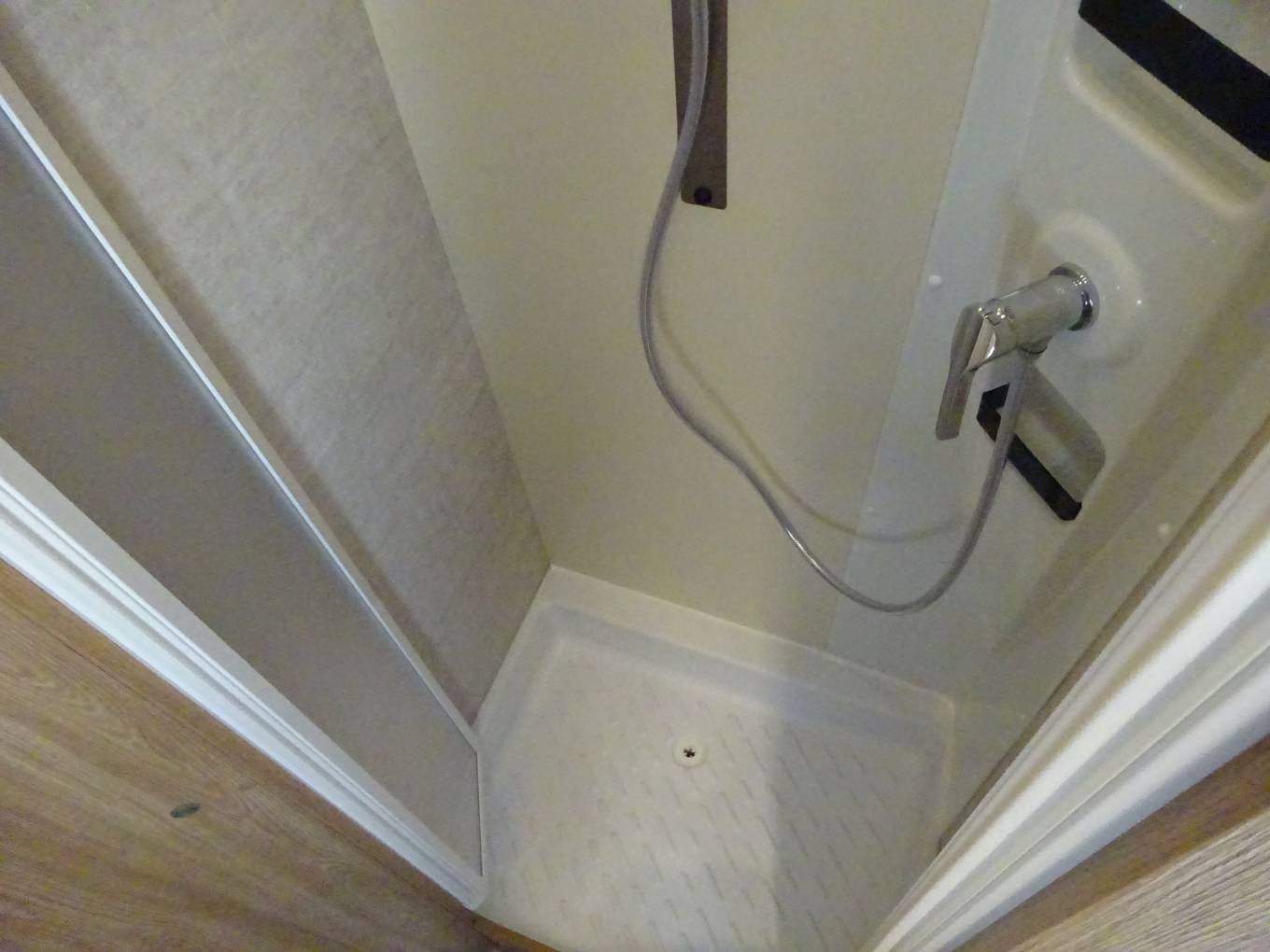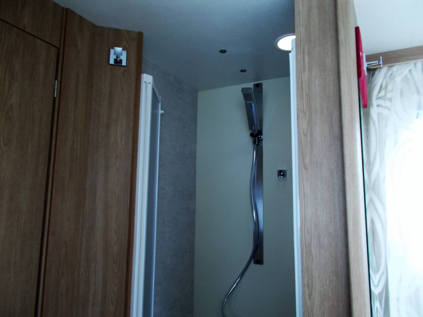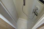 To the rear bedroom is a separate shower cubicle and oposite a tiolet and hand basin.