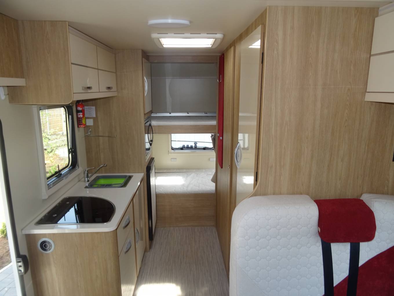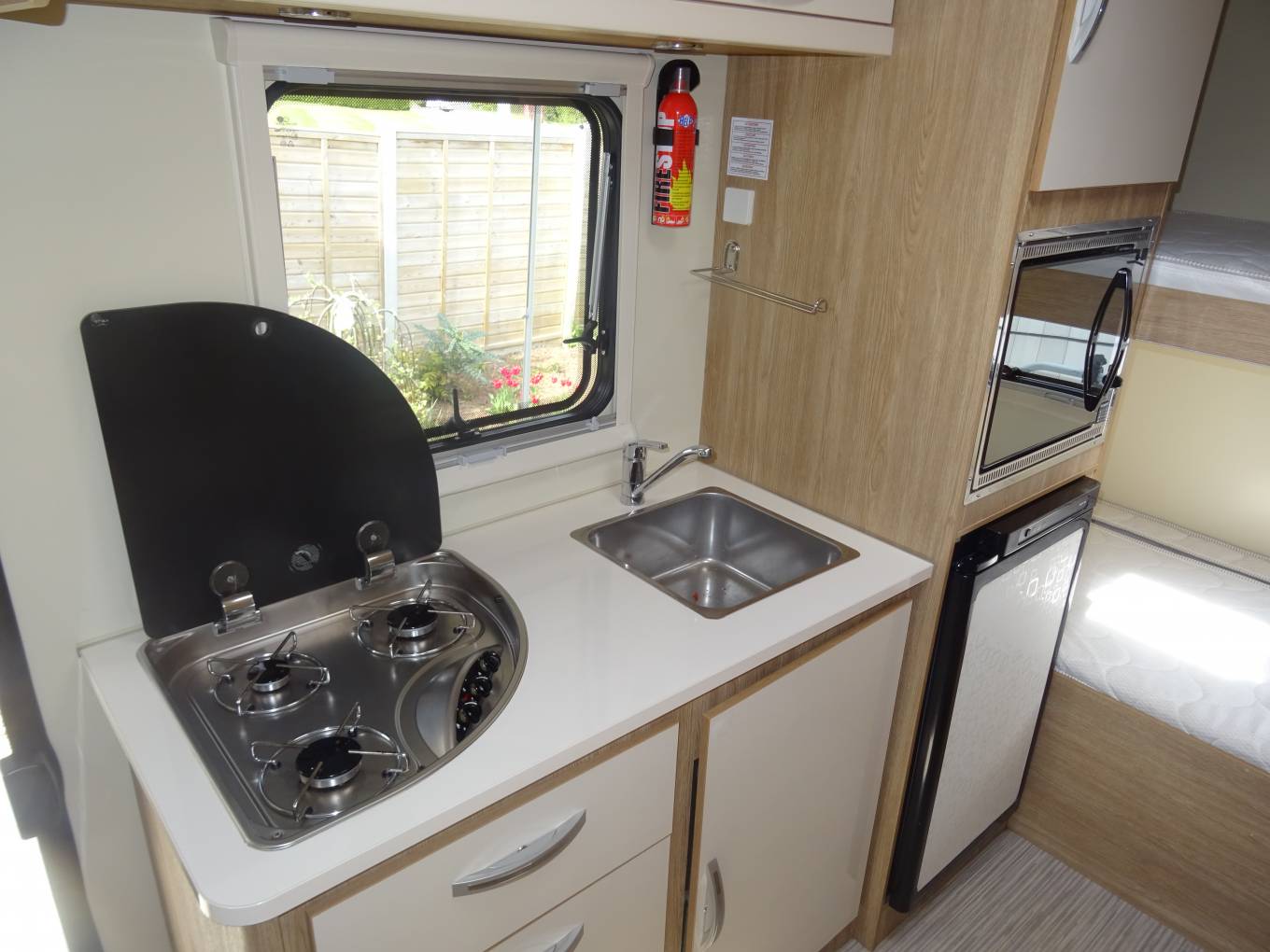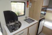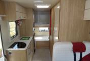 Moving to the centre of the habitation you have a fully equipped kitchen with oven, 3 gas ring hob, 3 way fridge, microwave, sink and plenty of storage.
