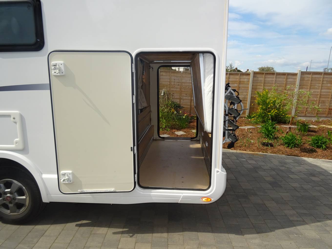 To the rear of the vehicle is your most versatile area. You have single bunk beds that still allows you a good amount of storage in the garage. If you don't require the bottom bunk bed this can be fastened up to give a very large garage area that can hold a full sized motorbike and more, with access doors from either side. Full garage size Height 2.0M, Width 2.3M, Depth 1.5M