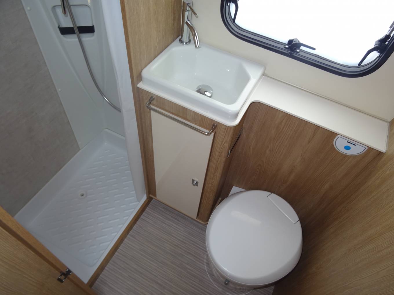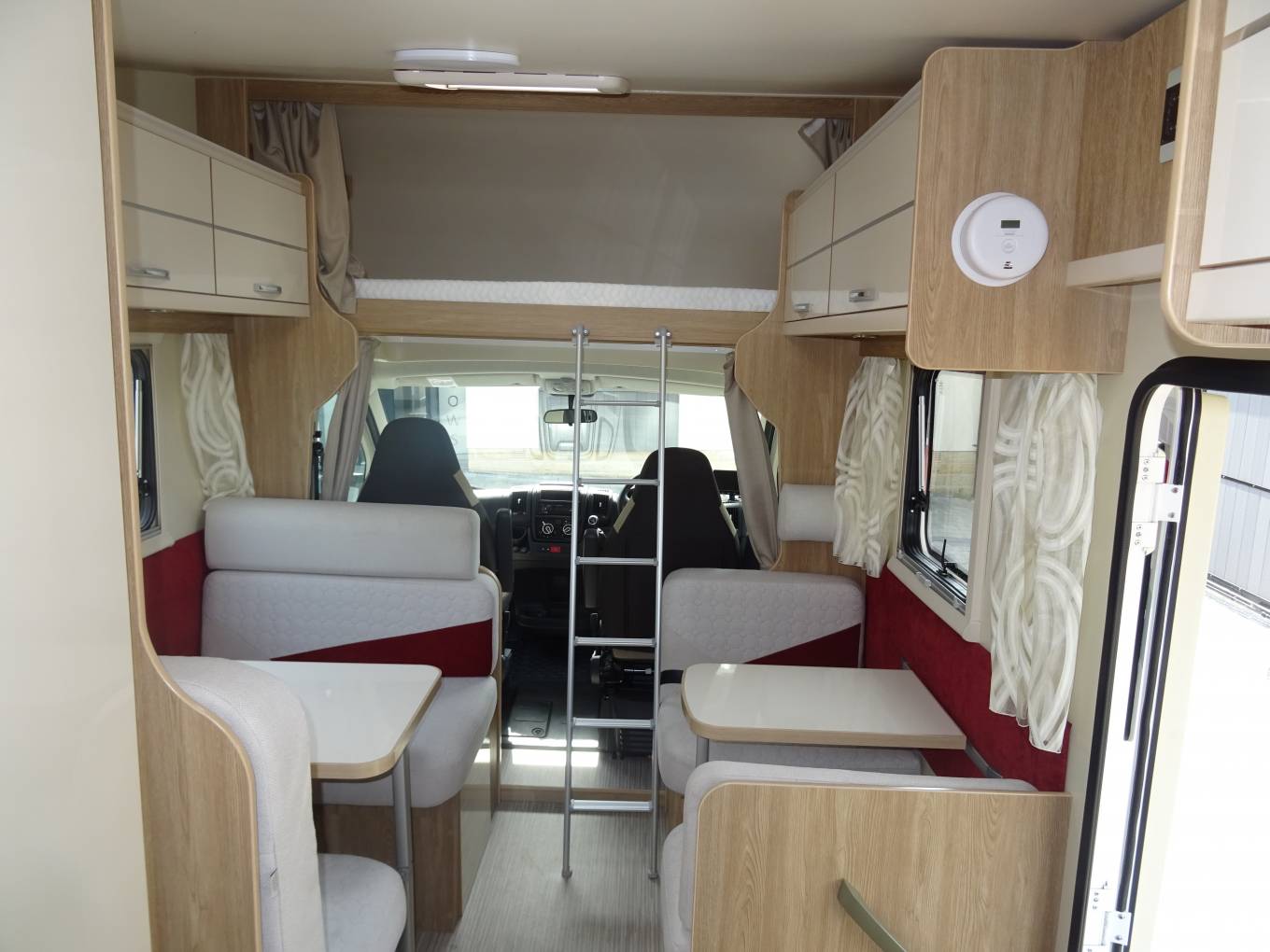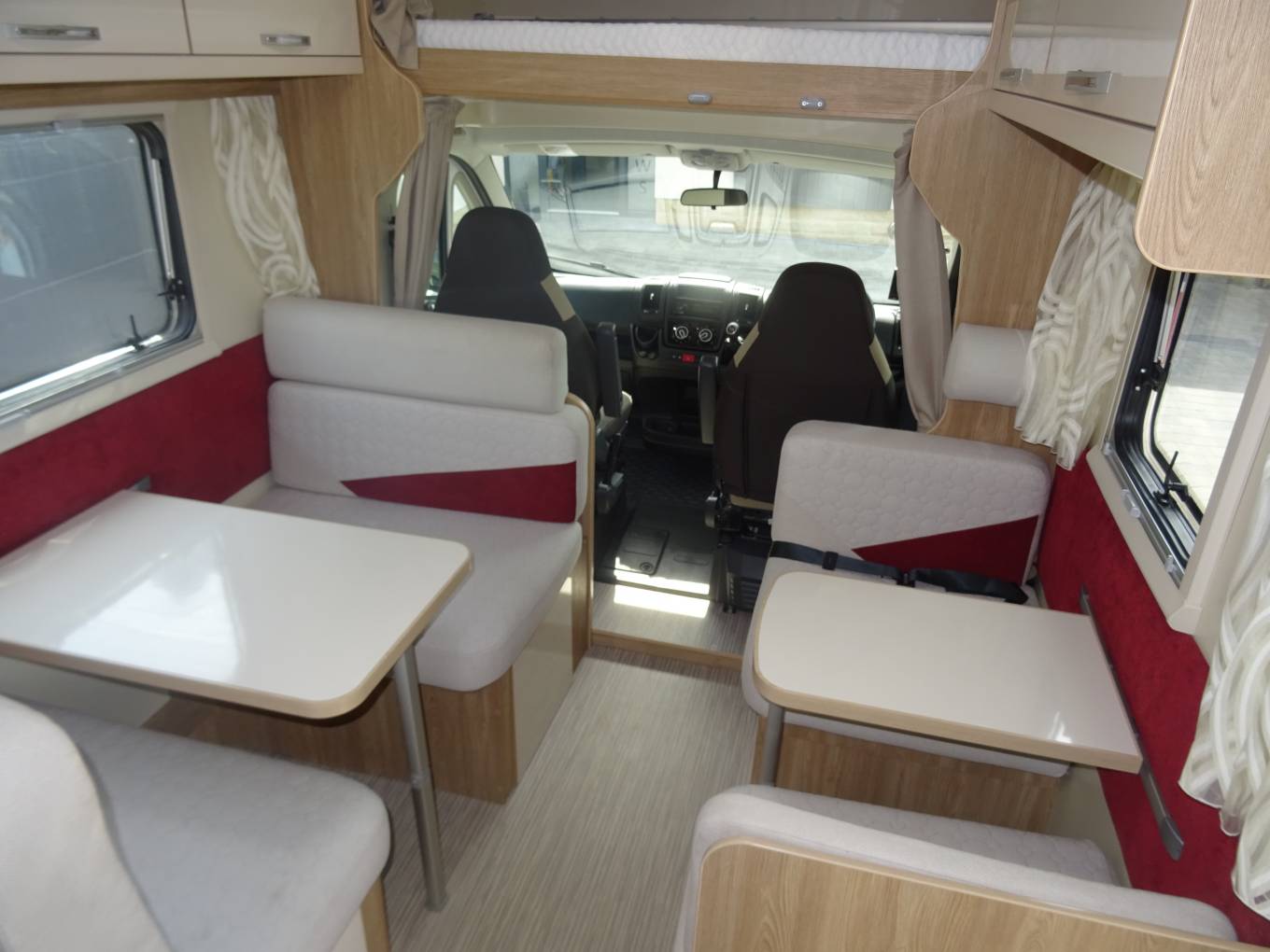Upon entering the habitation you have a large lounge, lovely open and light space with plenty of seating area to either side, both with collapsible dining tables. By night this area converts to one full sized double bed and to the other side a full sized single bed. You have a full king size over cab bed with reading lights and window, completing the 7 berth to the rear you have full sized single bunk beds.