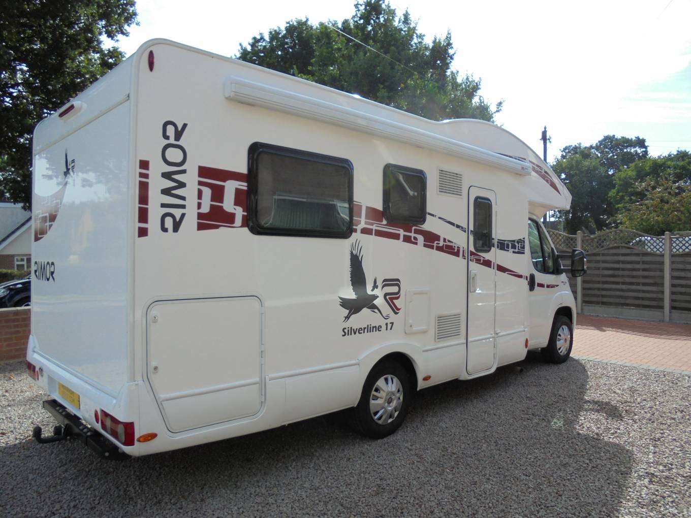 This is a Rimor special edition Silver Line with 5 berths and 5 seat belts it is based on the Fiat Ducato 2.3L 130BHP Euro 6 DCI engine and incorporates not only a fixed rear island bed but also an electric drop down double with a further single from the converted dinete.
