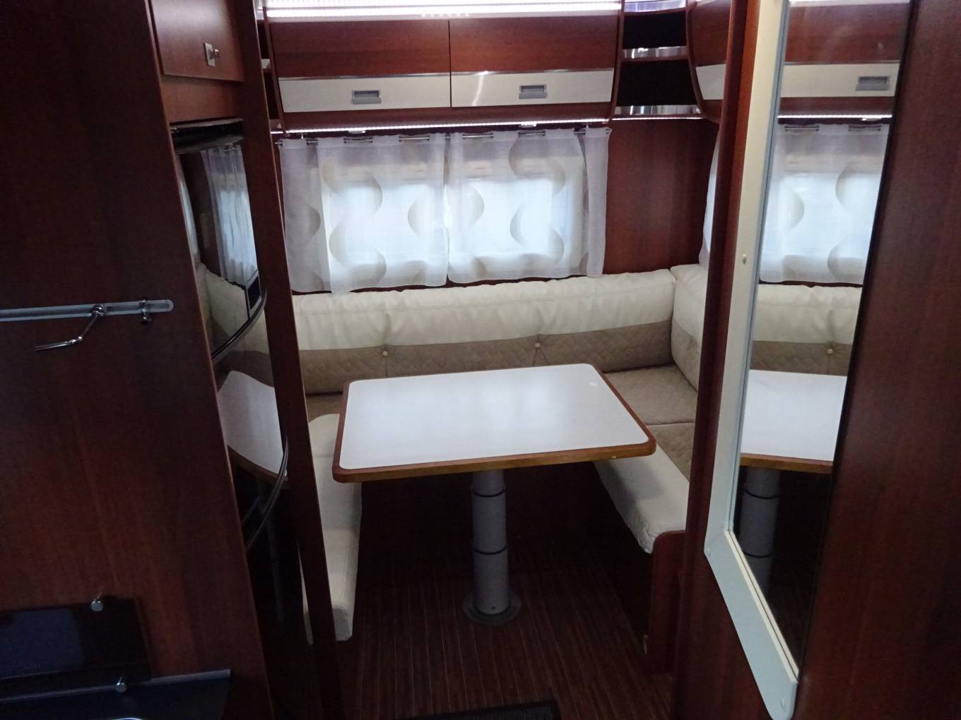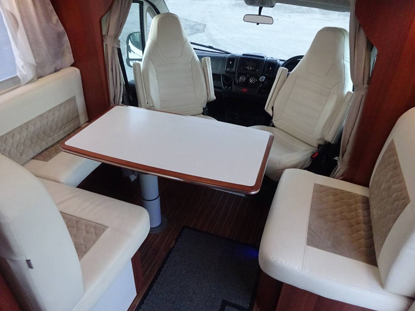 Cream half faux-leather upholstery throughout, the front lounge has seating for five around the fixed sliding table.