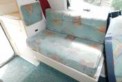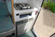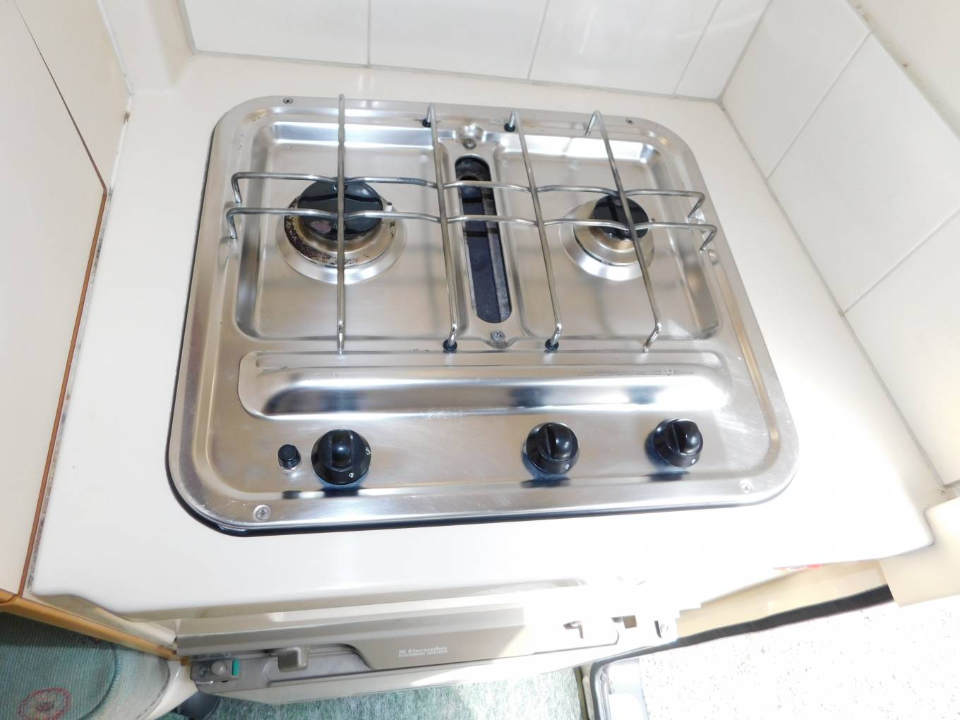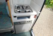 Step inside the rear door and you enter the kitchen area, with the stainless steel 2 gas burner hob and a gas grill beneath, plus a three-way powered fridge with ice-box. Opposite is the sink with a cold tap, tip the sink up to empty it, plus two pop-up counters provide additional preparation space.