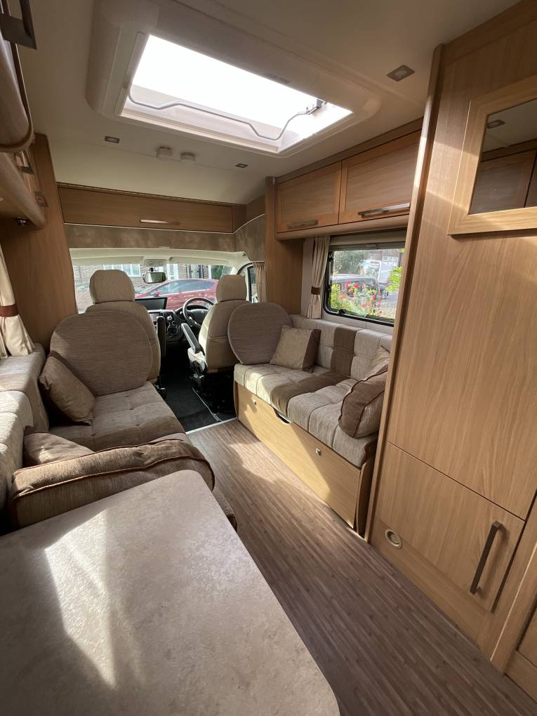 This motorhome is compact and very practical vehicle at just 5.7m long has been extremely well cared for, a true couples motorhome. It has a 2.2L engine, manual gearbox, mileage standing ant 35361 and is in beautiful condition and very spacious on the inside. With its long sofa's finished in lovely neutral colours, which convert to either two singles or a large double at night, this motorhome also has plenty of storage lockers and a very large wardrobe.