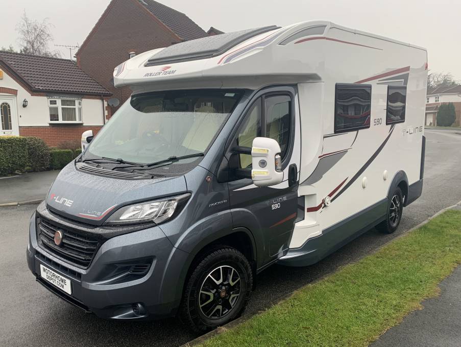 Call with any questions on 01423 609985. This Roller Team Auto Roller T Line 590, is a fantastic low profile, 4 berth, rear washroom, coachbuilt motorhome.